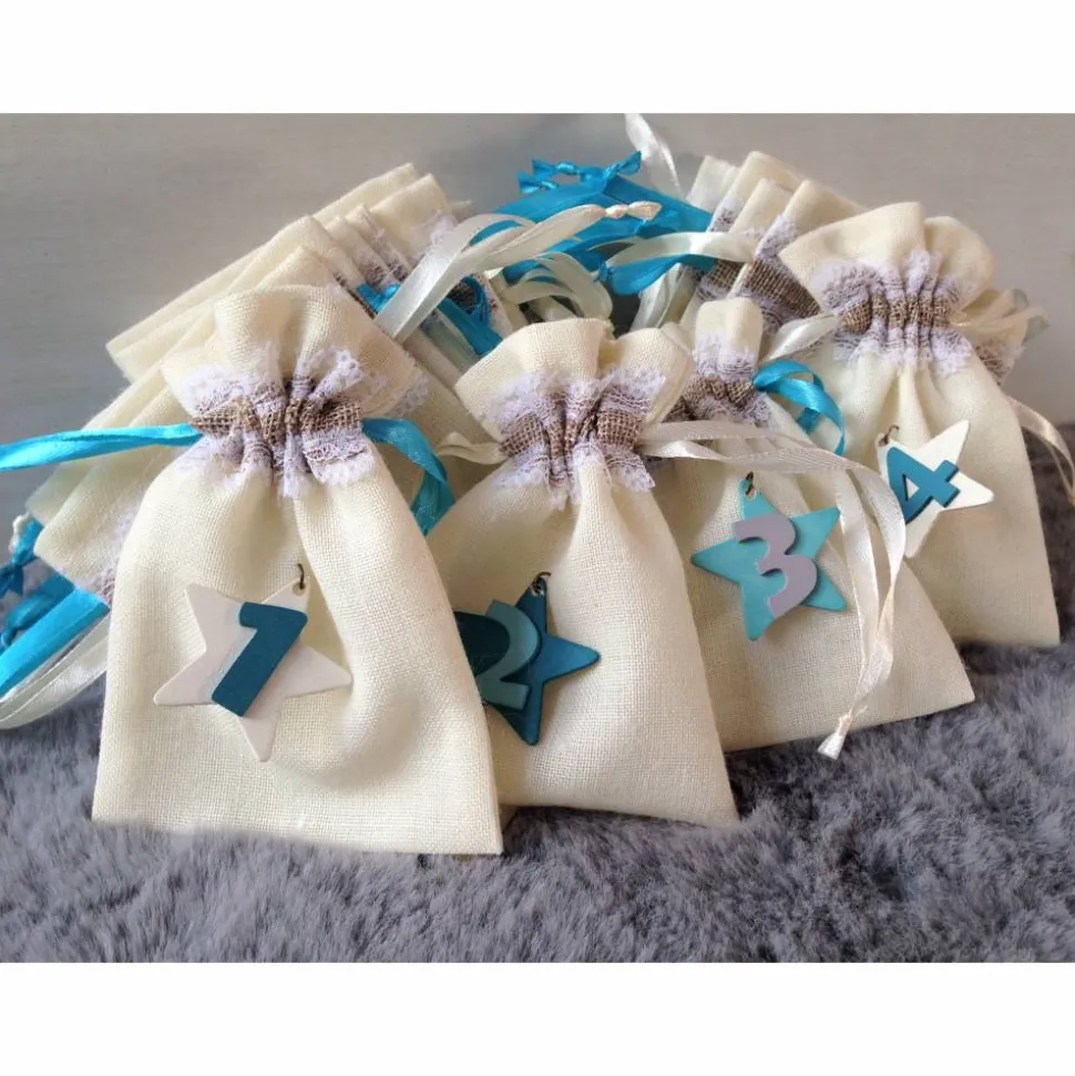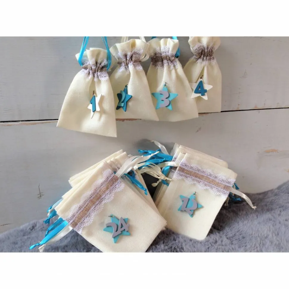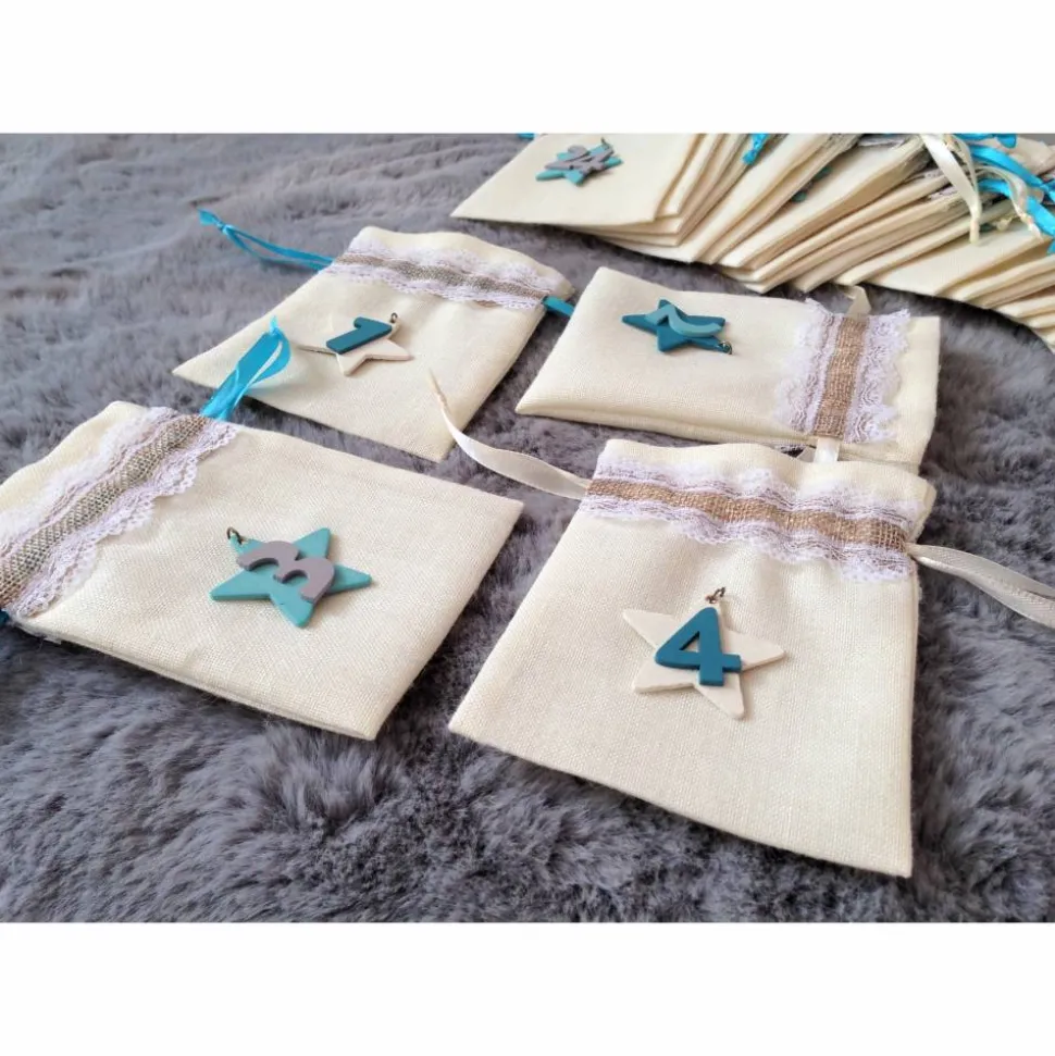 Große Sterne mit Holzzahlen in türkis und weiß, geben den Säckchen den nötigen Pfiff.