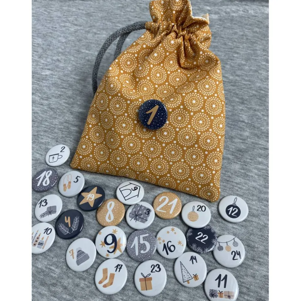 Diese handgefertigten Buttons mit den Zahlen 1 bis 24 machen deinen selbstgebastelten Adventskalender zu etwas ganz Besonderem. Jeder Button ist ca. 25 mm groß und mit einer kleinen Sicherheitsnadel versehen – so lassen sie sich ganz einfach an Beuteln oder Säckchen befestigen, ganz ohne Kleben oder Nähen oder Knoten.