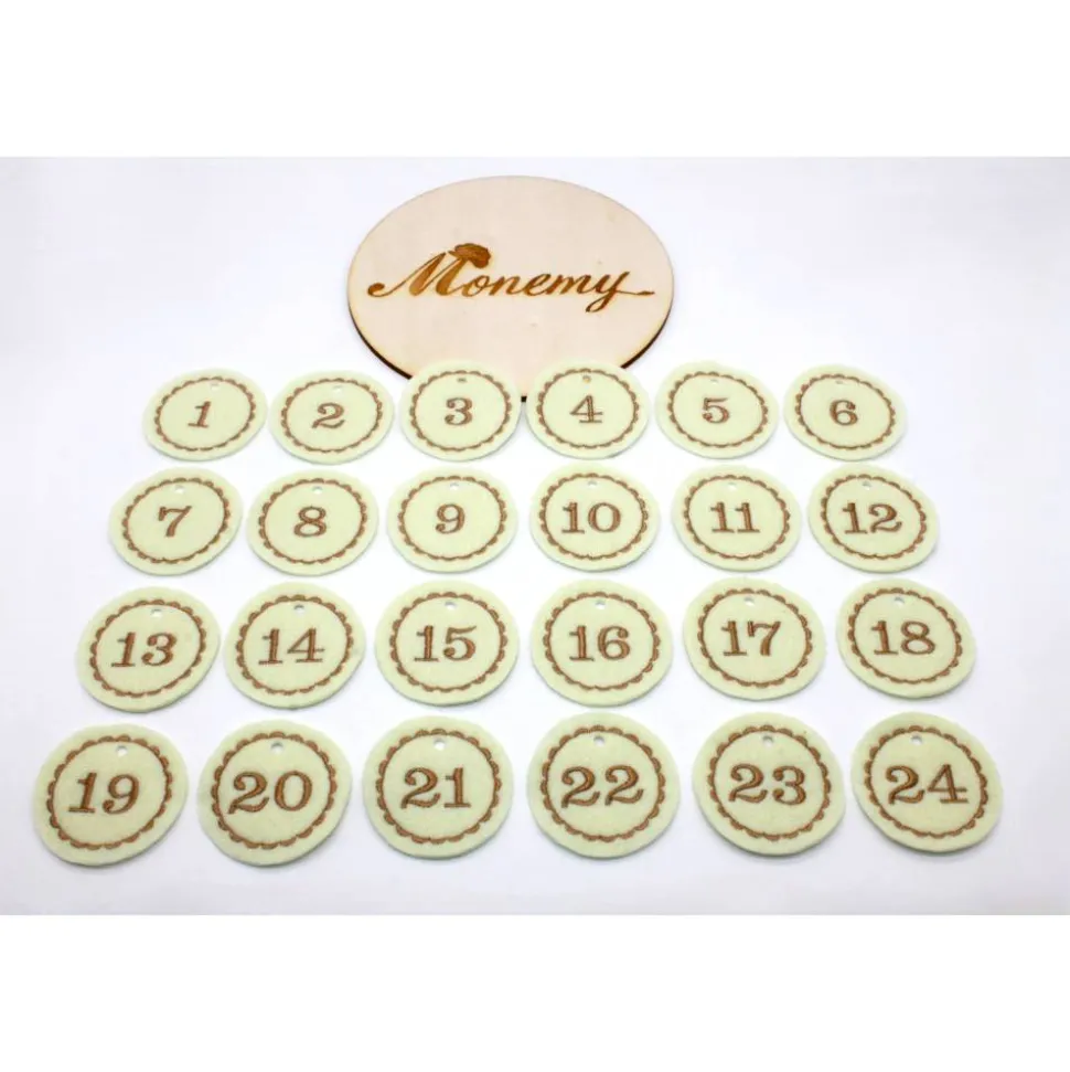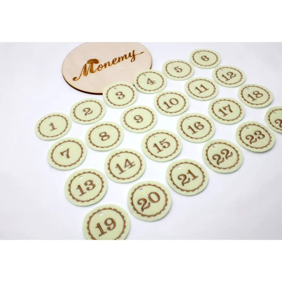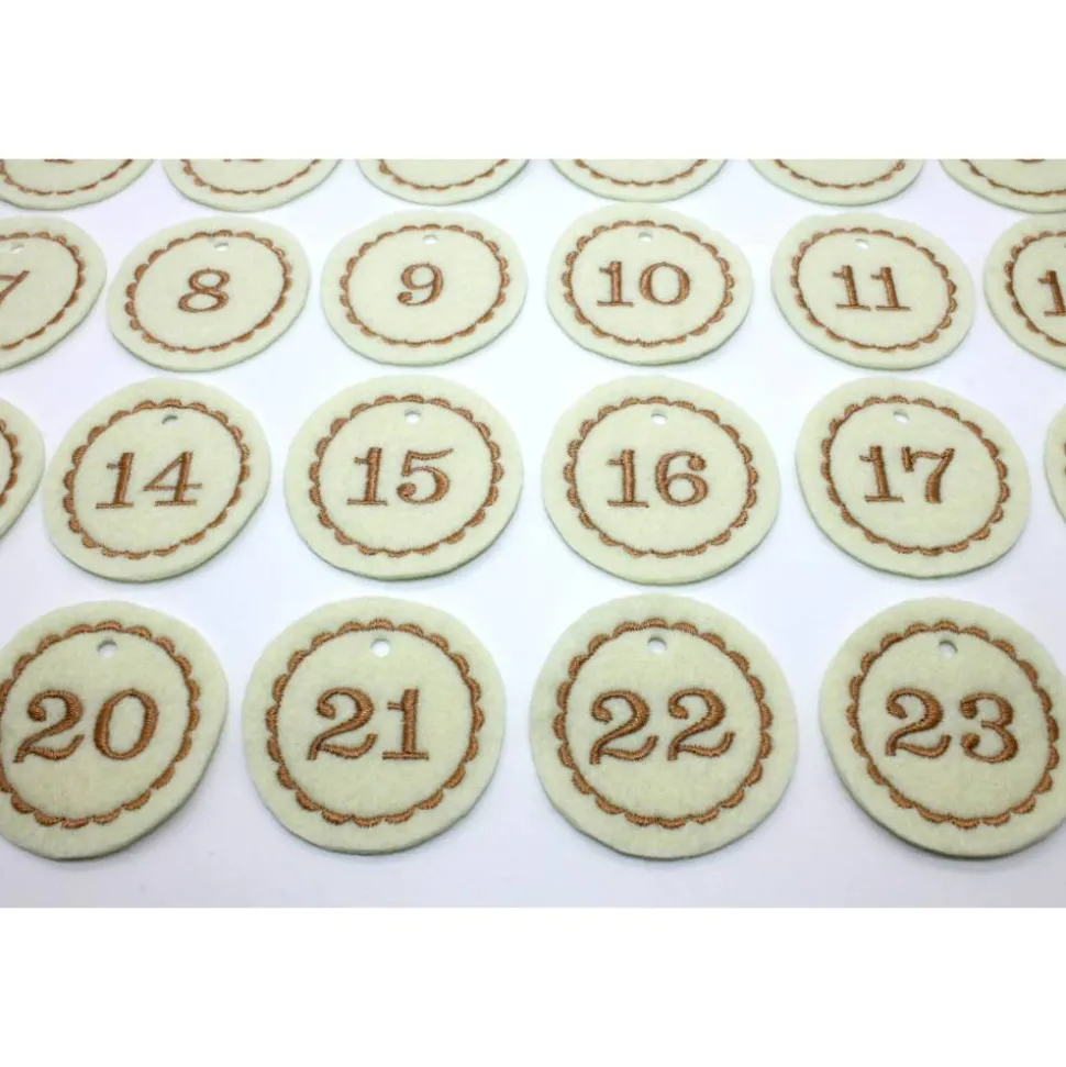 Die runden Adventskalenderzahlen wurden mit den Zahlen bestickt und bleiben daher lange erhalten. Sie lösen sich nicht einfach ab und können so mehrere Jahre genutzt werden. Die Zahlen aus Filz machen jeden Adventskalender zu etwas Besonderem und können als Anhänger an dem Säckchen, Tütchen oder kleinen Geschenken angehängt werden.