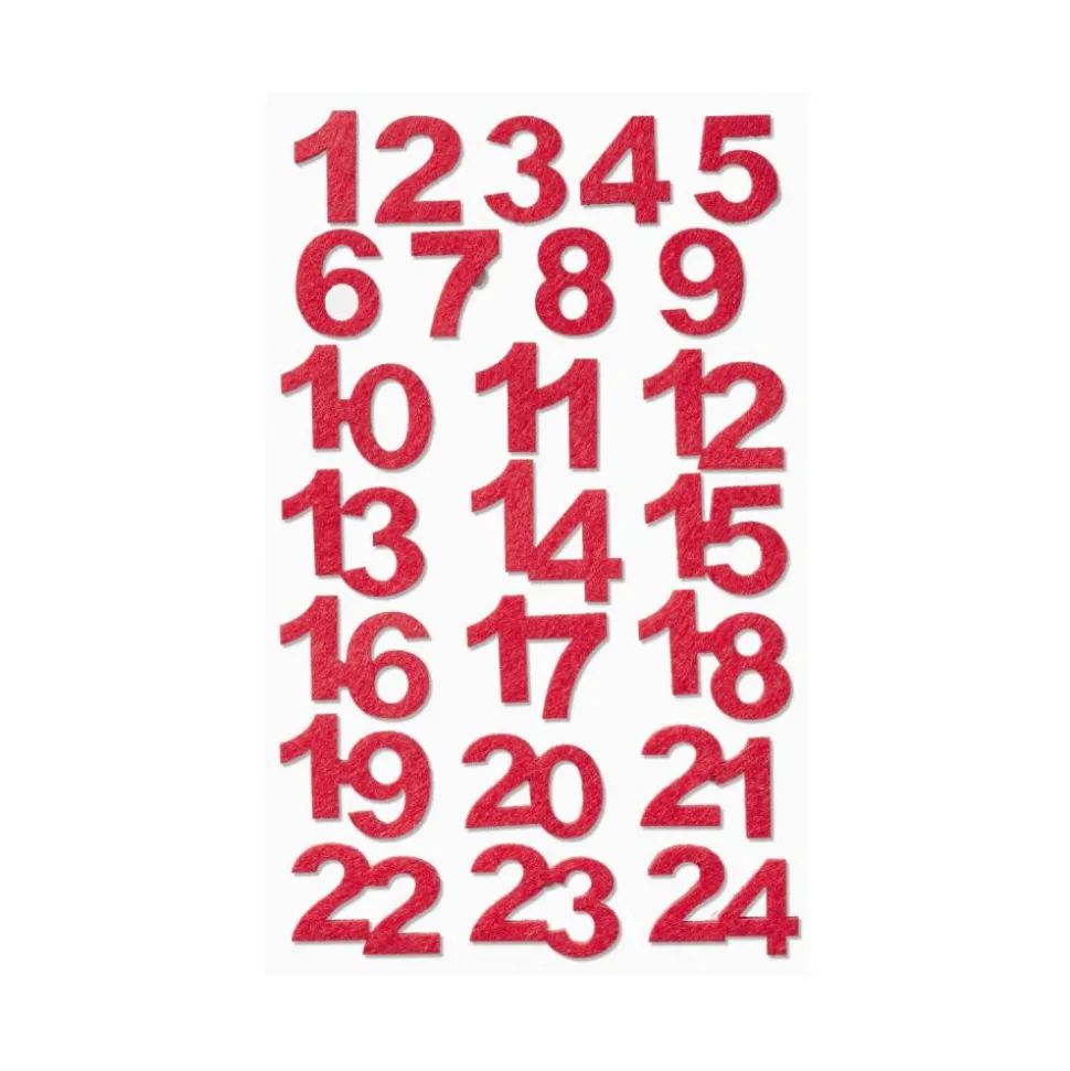 Die roten Zahlen sind rückseitig mit einem Klebepunkt versehen. Die Adventskalenderzahlen haben eine Höhe von bis zu 25 mm. Die Filzzahlen haften gut auf Papier und Karton.