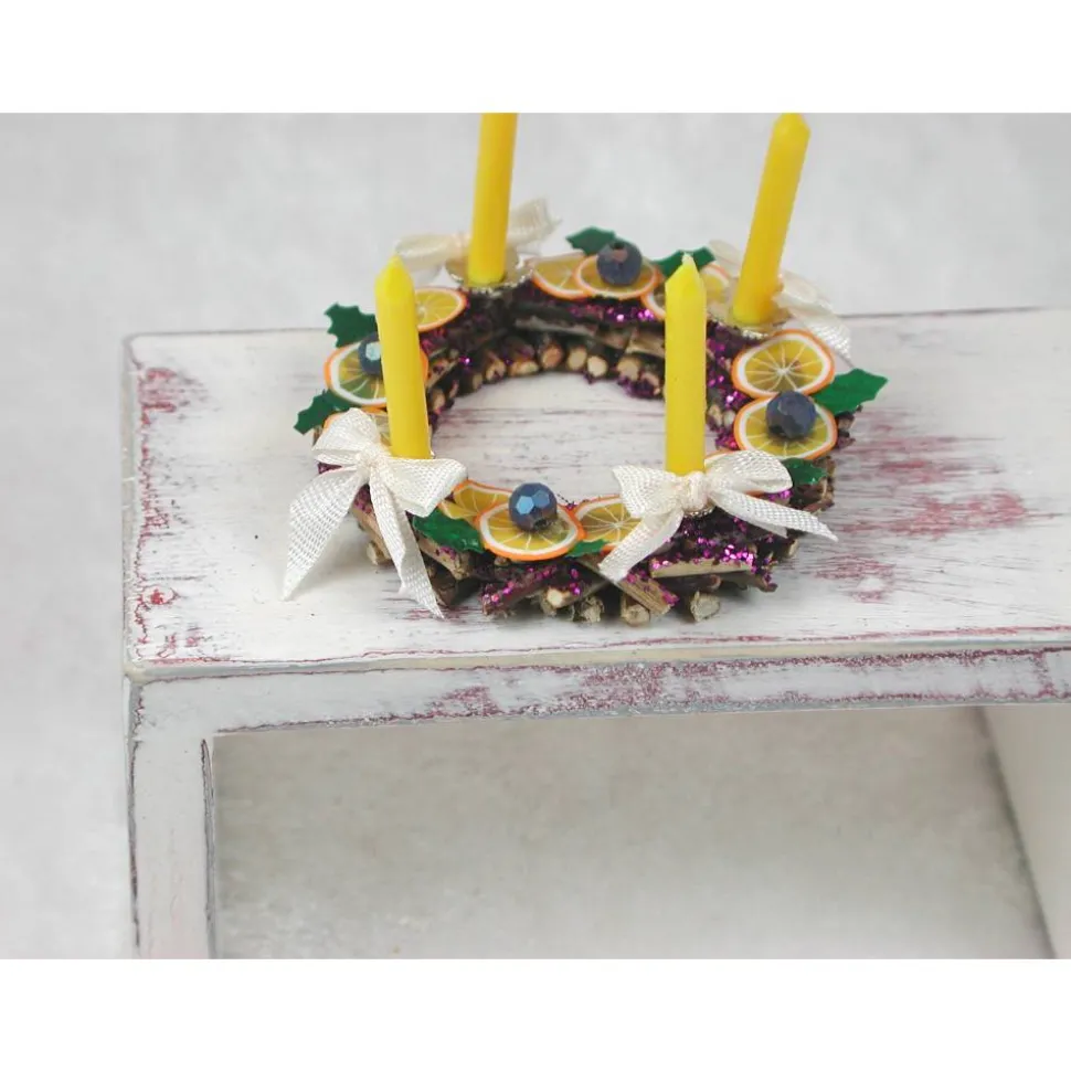 Der Holzkranz ist aus kleinen Ästchen hergestellt, die Kerzenhalter aus Metall Perlkappen und mit echten gelben Wachskerzen bestückt.