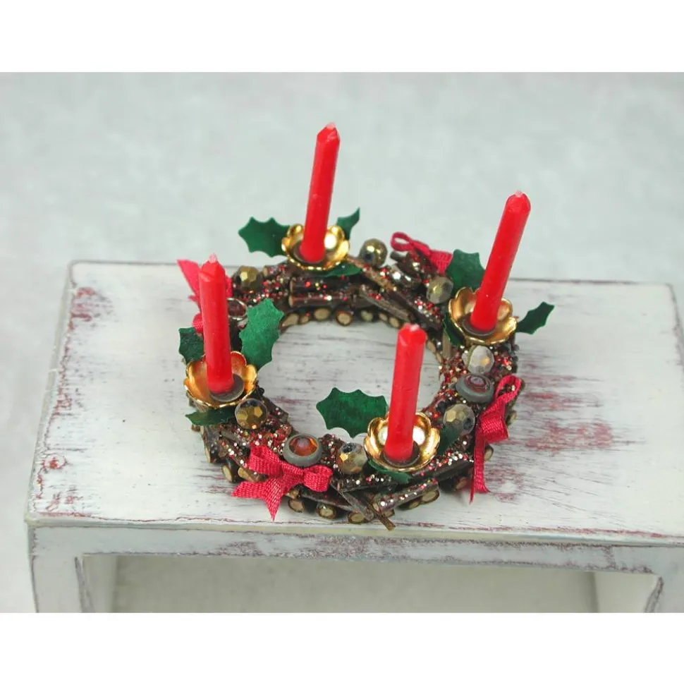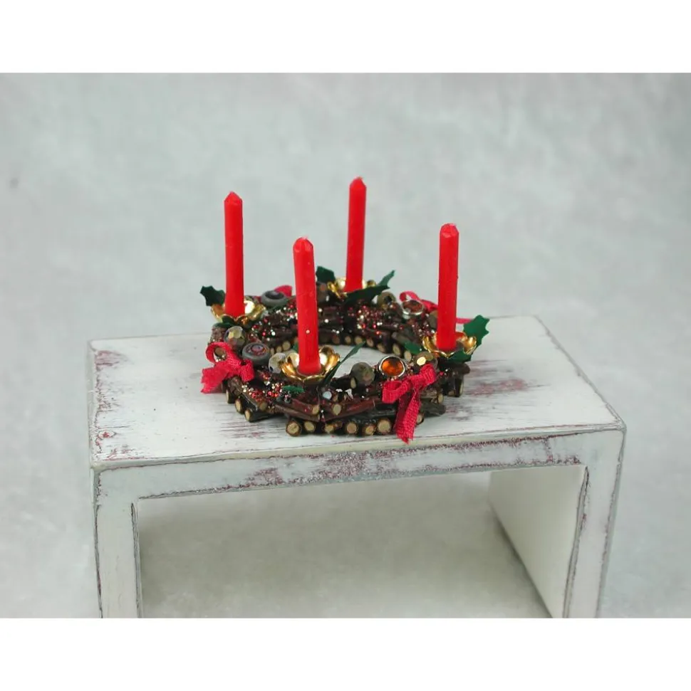 Der Holzkranz ist aus kleinen Ästchen hergestellt, die Kerzenhalter aus Metall Perlkappen und mit echten gelben Wachskerzen bestückt.