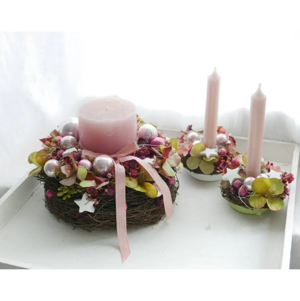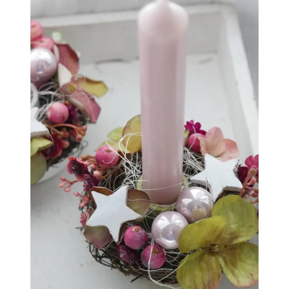 Entdecke den einzigartigen Adventskranz Hortensie! Dieser festliche, handgefertigte Kranz vereint wunderschöne, haltbare Blütenköpfe (Kunstblumen) in grün, fuchsia und rosa zu einer harmonischen Einheit. Spiegelbeeren aus Glas in rosa, weiße Kokossterne, künstliches Schleierkraut und Schein-Beeren wurden kunstvoll arrangiert und mit einer durchgefärbten Kerze in der Mitte abgerundet.