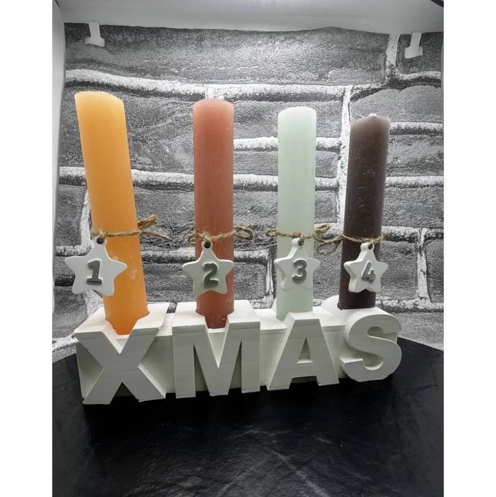 XMAS mit 4 Kerzen und gegossenen Zahlen als Tannenbaum, Stern oder runde Scheibe, frei wählbar, Kerzen nicht wählbar. (Kommen bunt)