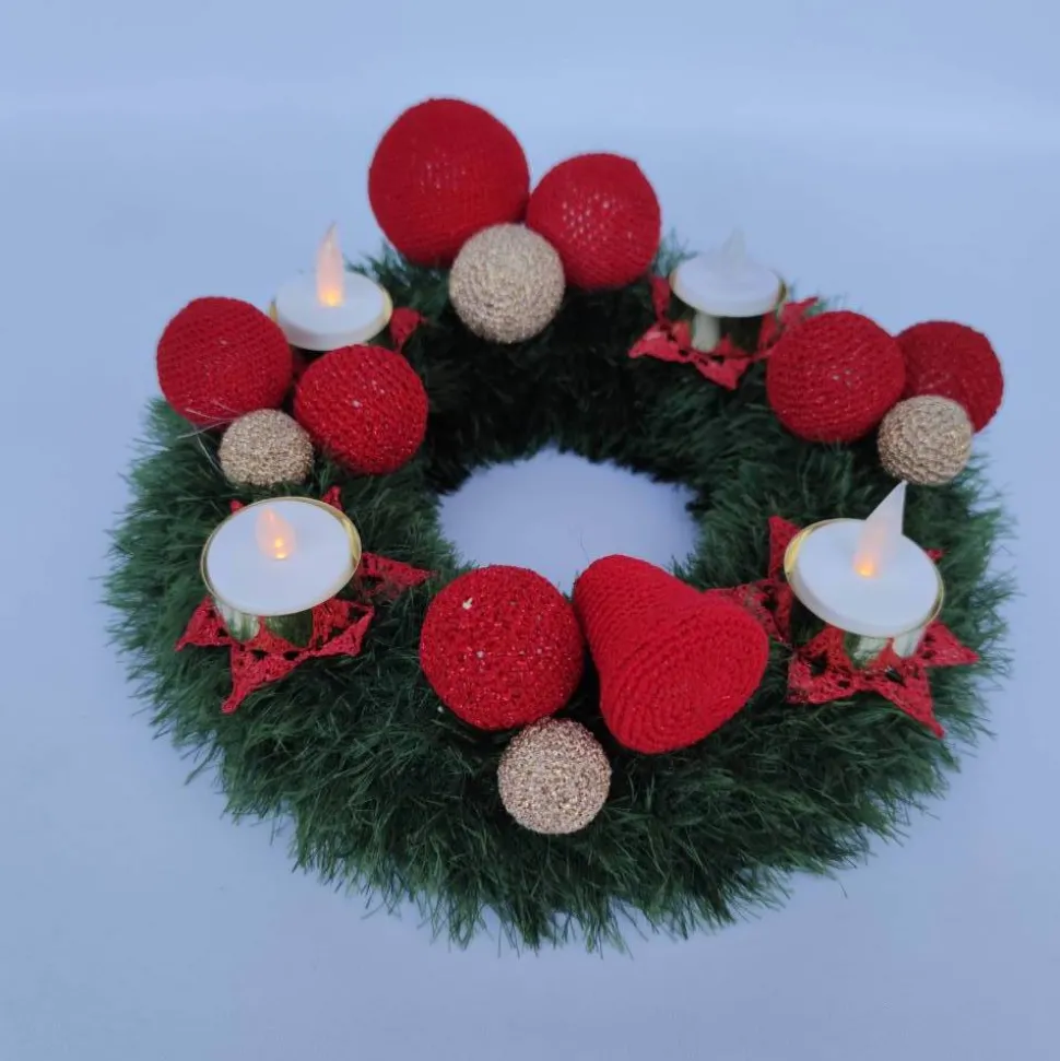 dafür habe ich einen Styroporring mit Fransengarn umstrickt, dekoriert mit 4 Metallkerzenhalter für LED Teelichter, die auf einem roten gehäkeltem Stern befestigt sind , gehäkelte Kugeln in unterschiedlicher Größe und Farbe (rot und gold) und 1 gehäkeltes Glöckchen komplettieren diesen Kranz