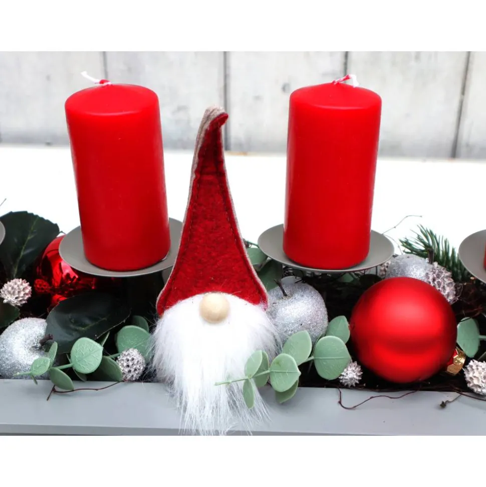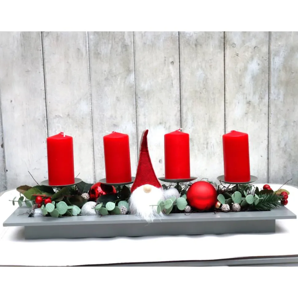 Wunderschönes modernes Adventsgesteck in rot, grün und weiß. An diesem Gesteck haben Sie lange Freude, da alle verwendeten Materialien lange haltbar sind, Sie brauchen nur die Kerzen auszutauschen. Das schicke Holztablett mit integrierten Kerzenhaltern wurde mit jeder Menge toller Materialien dekoriert.