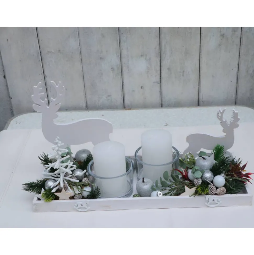 Wunderschönes modernes Adventsgesteck in weißmit zwei großen Hirschen. An diesem Gesteck haben Sie lange Freude, da alle verwendeten Materialien lange haltbar sind, Sie brauchen nur die Kerzen auszutauschen. Das schicke Holztablett wurde mit jeder Menge toller Materialien dekoriert. Da die Kerzen in dickwandigen Glashaltern stehen, können Sie diese problemlos austauschen.