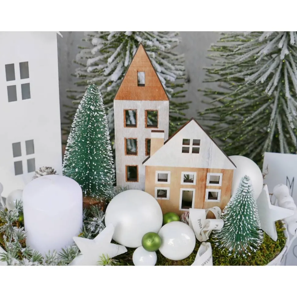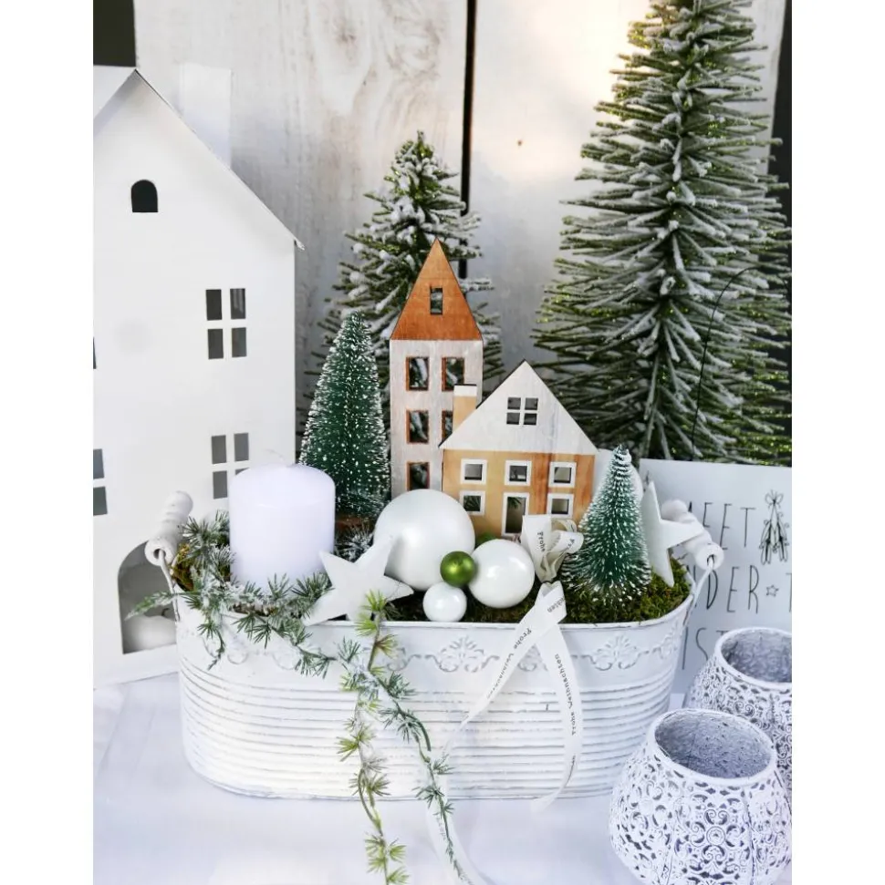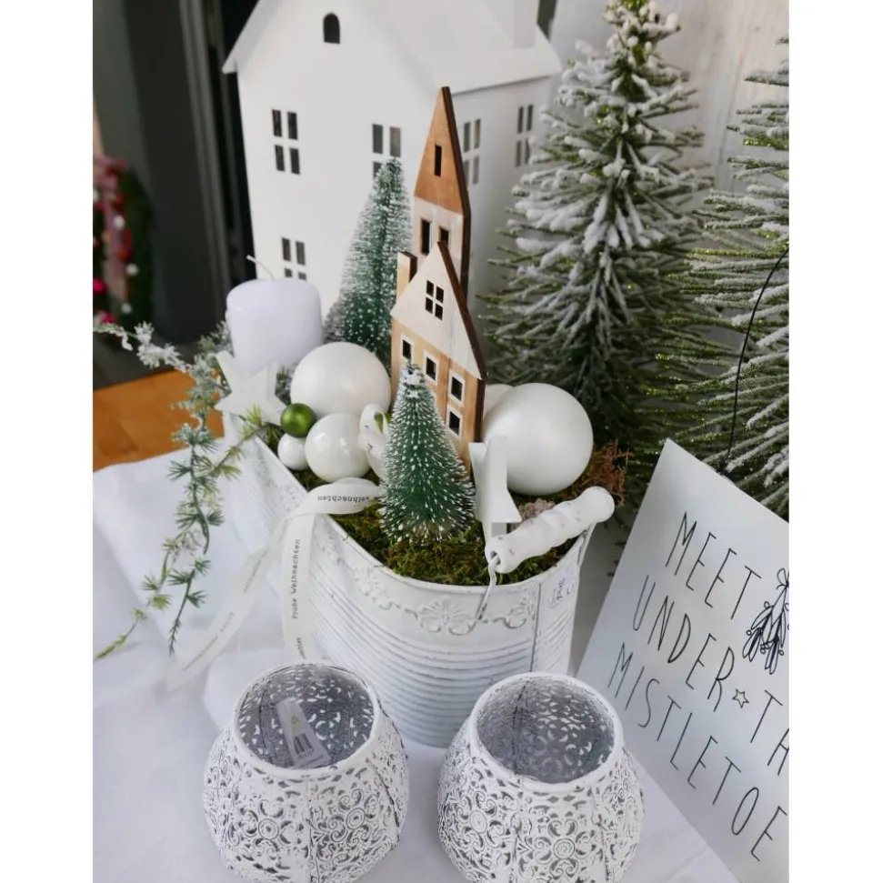 weißen Kugeln, Bürstenbäumchen, Natur-Zapfen, Holzsternen, Band und künstlicher Erlengirlande auf echtem Moos.