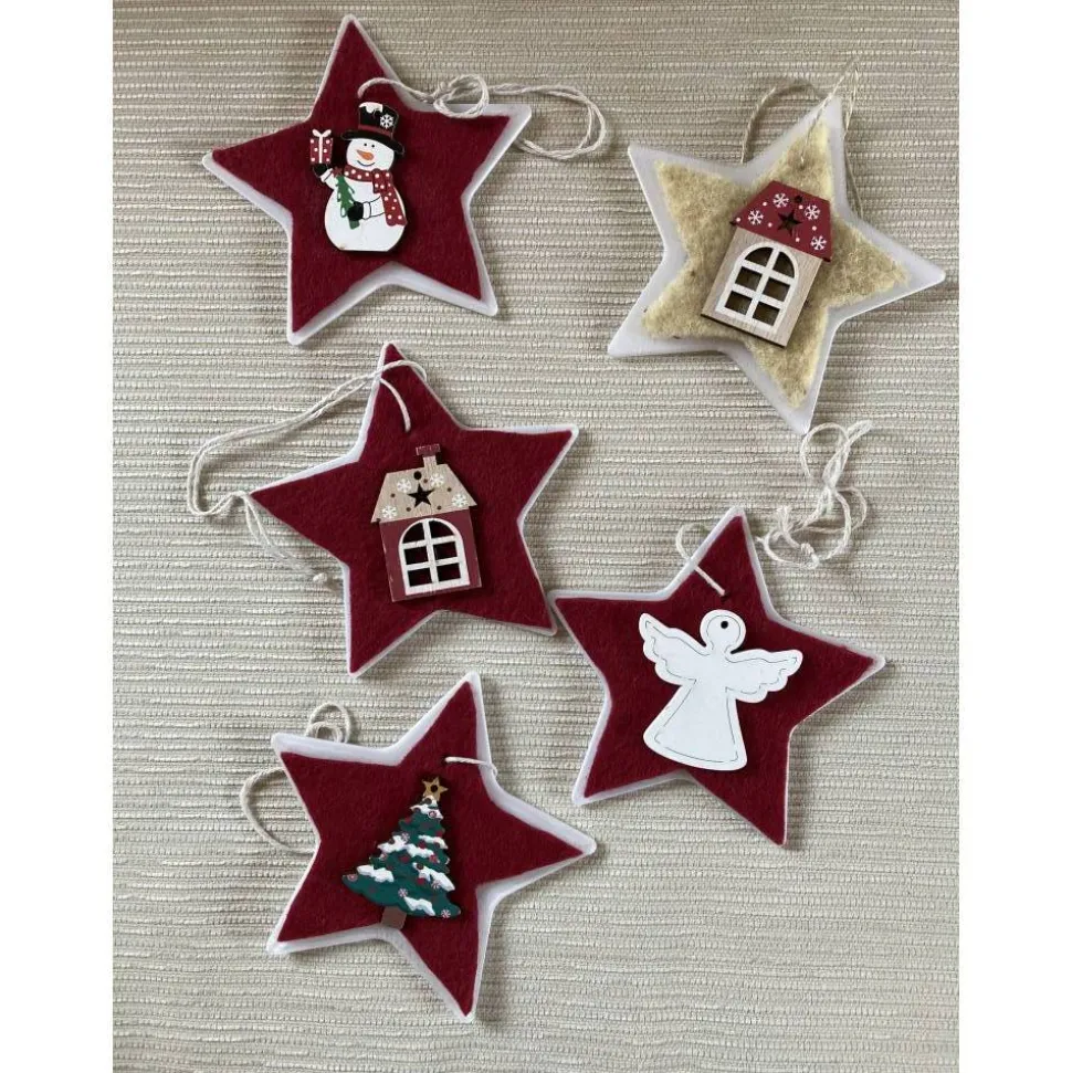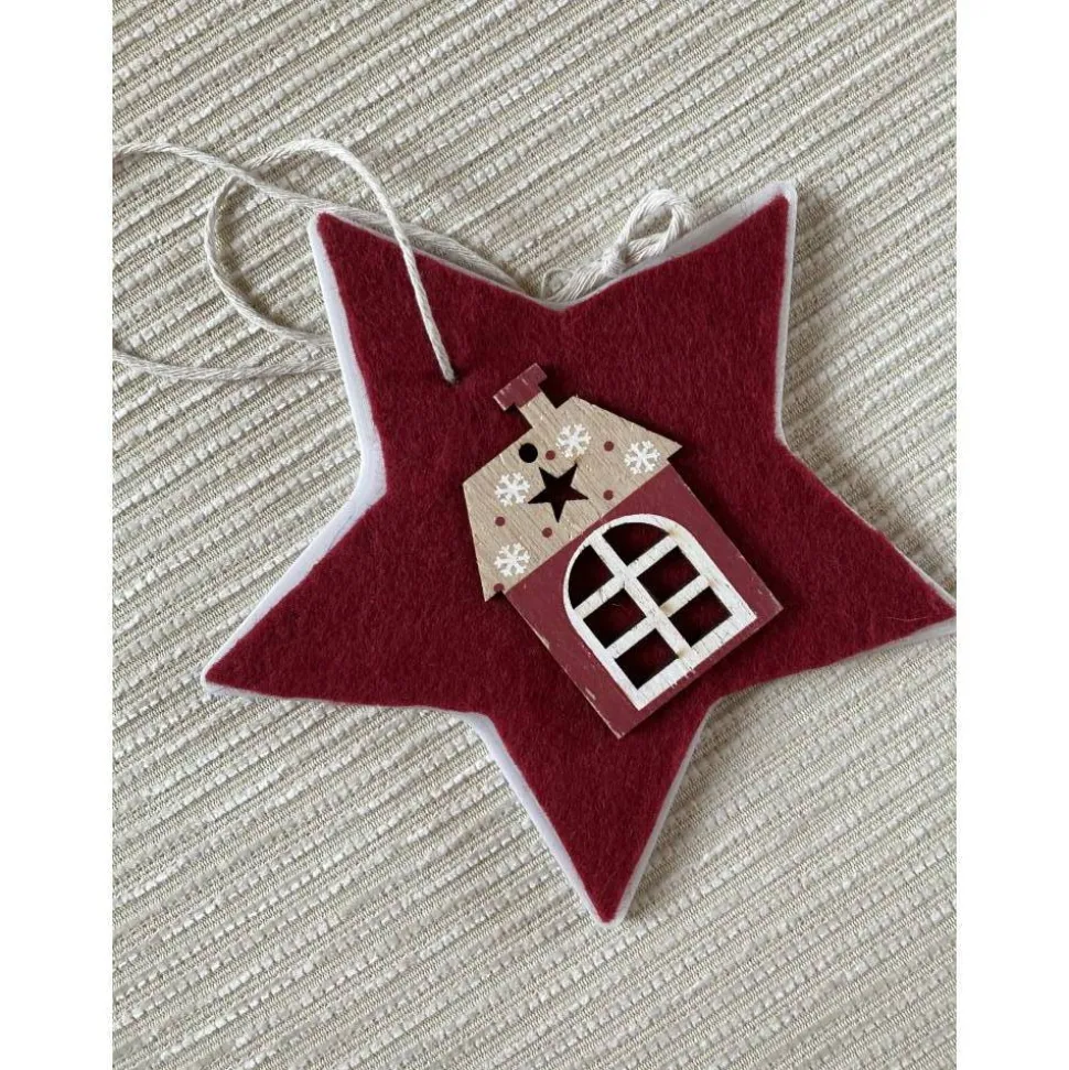 Der in transparent-weiß gedruckte 3-D-Stern nach eigenem Entwurf ist zusätzlich mit Dekorations-Elementen ausgestaltet. Wahlweise ist das Motiv (Holzhaus-Anhänger mit unterschiedlichen Farben) auf kräftig-rotem Filz oder creme-gelb-farbener Schafwolle aufgebracht. Die Aufhängung ist in den 3-D-Druck integriert.