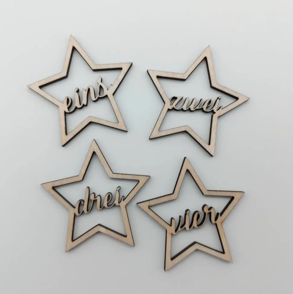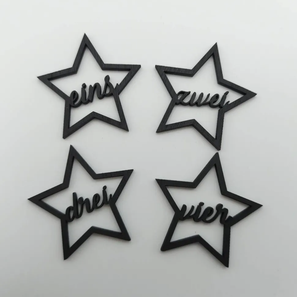 Geliefert wir ein 4er Zahlenset im Sterne Design: eins (1), zwei (2), drei (3), vier (4)