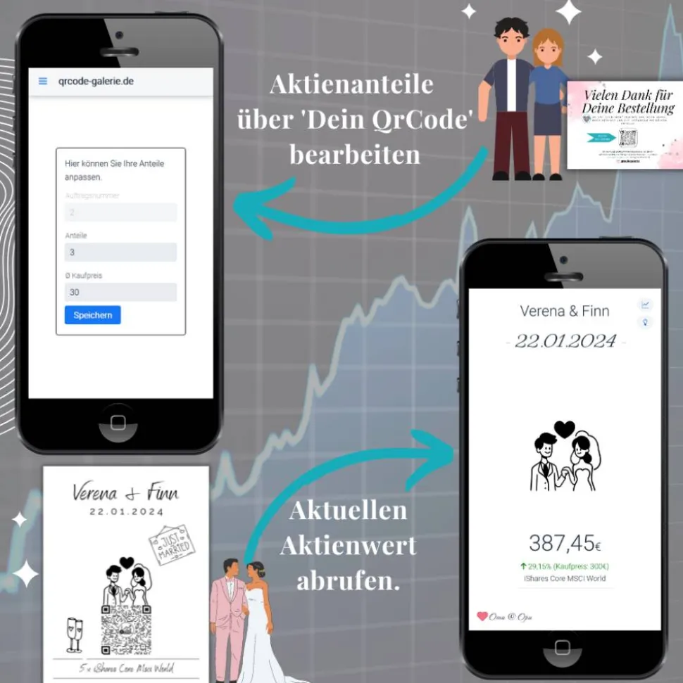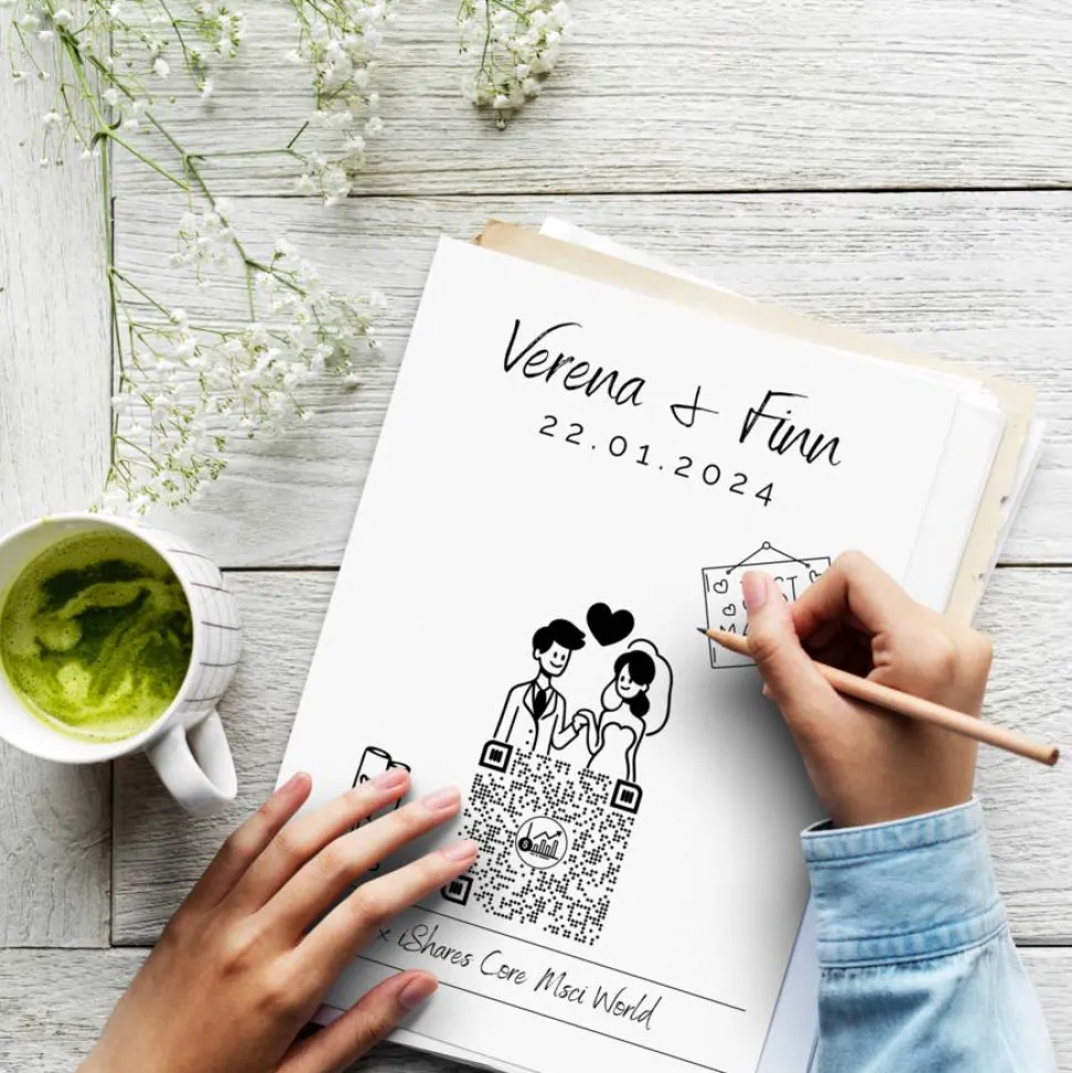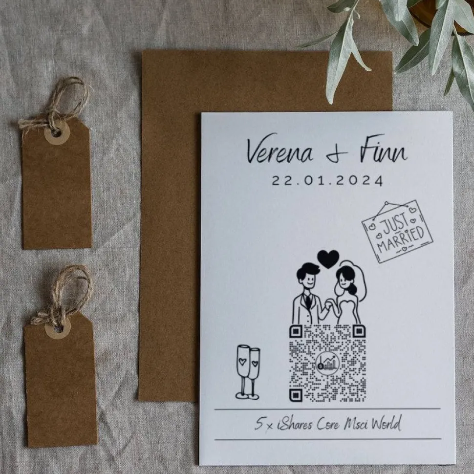 Aktiengeschenk Hochzeit | Personalisiertes Geldgeschenk | Aktie ETF Kryptowährung QrCode Geschenkkarte | Brautpaar