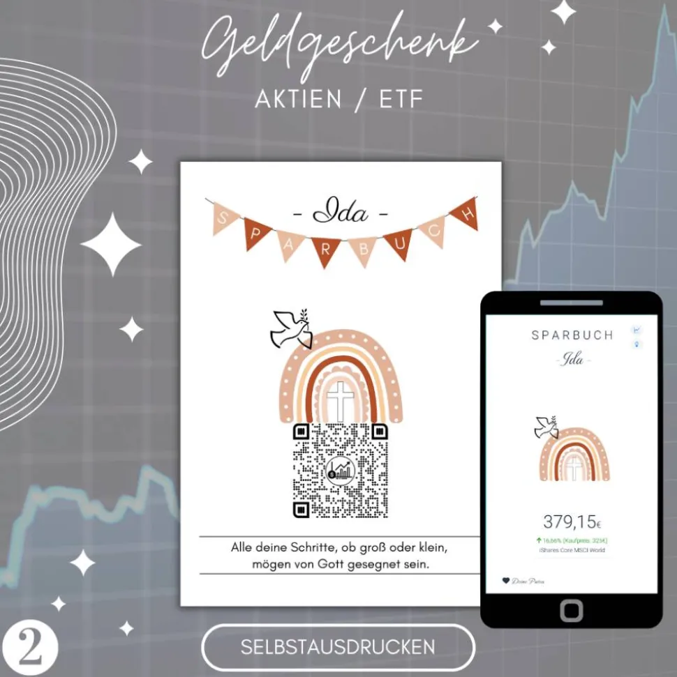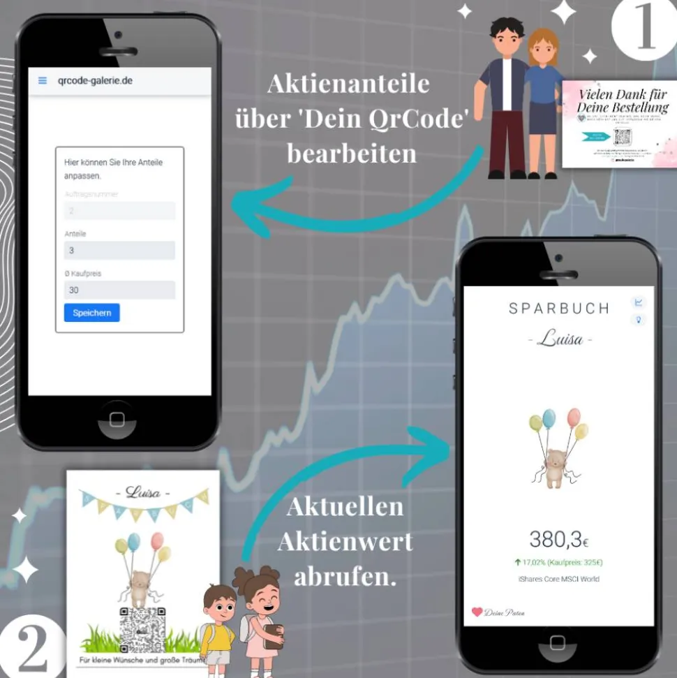 2) Du erhälst von uns „Deinen QrCode“ auf einem seperaten Bild. Über diesen QrCode kannst du die Aktienanteile hinterlegen die du bereits gekauft hast. Die Anzahl lässt sich jederzeit ändern. Dadurch kannst du bei deiner Bank/Broker einen Sparplan anlegen und/oder die Aktienanteile zum Geburtstag, Weihnachten etc. über die Jahre aufstocken.