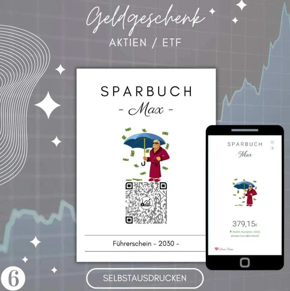 3) Scannt der beschenkte den QrCode auf seinem Bild, sieht er jedes Mal den aktuellen Wert seiner Aktie. Den Wert der Aktie übergibst du ihm/ihr dann zum abgemachten Zeitpunkt (z.B. zu Beginn des Führerschein, zum 18. Geburtstag, oder zur erfolgreichen Fahrprüfung).