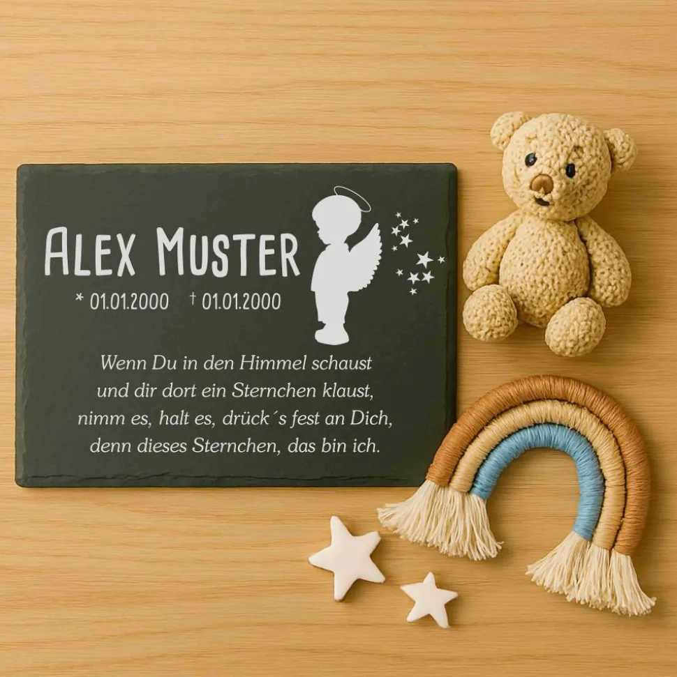 Persönliches Erinnerungsstück: Die langlebige Gravur macht die Schieferplatte zum idealen Grabstein oder Gedenkstein für dein Sternenkind. Deine Wünsche stehen bei uns im Mittelpunkt – wir setzen jeden Auftrag mit viel Herz und Sorgfalt um.