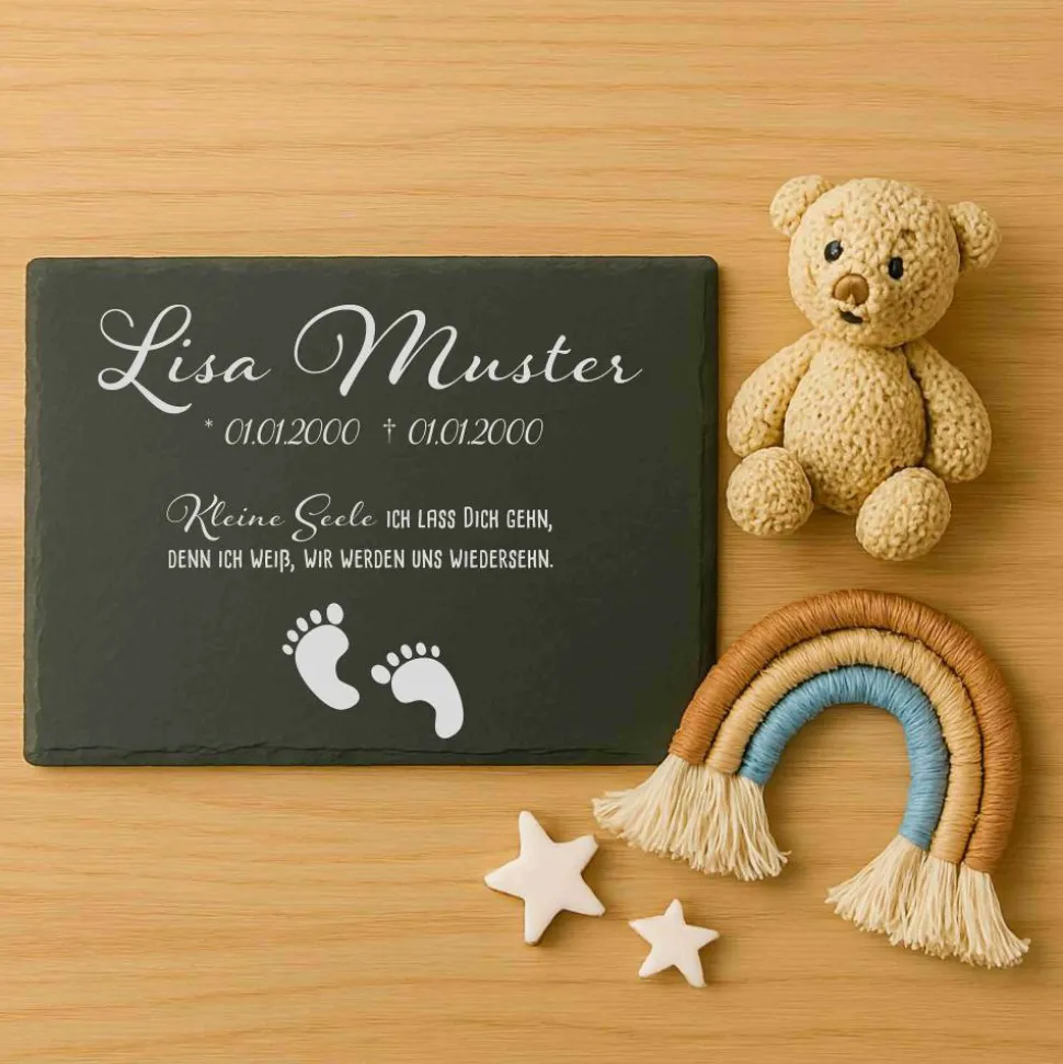 Andenken an Sternenkinder – Schiefertafel mit Namen, Datum und süßen Motiven – Erinnerung für Zuhause oder Garten