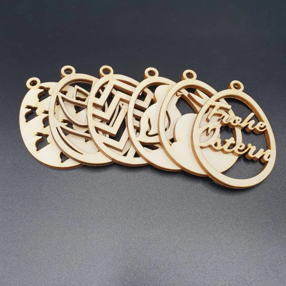 Die Anhänger isnd aus 4mm dickem Pappel-Sperrholz, sie sind jeweils 7,6cm hoch und 5,3cm breit.