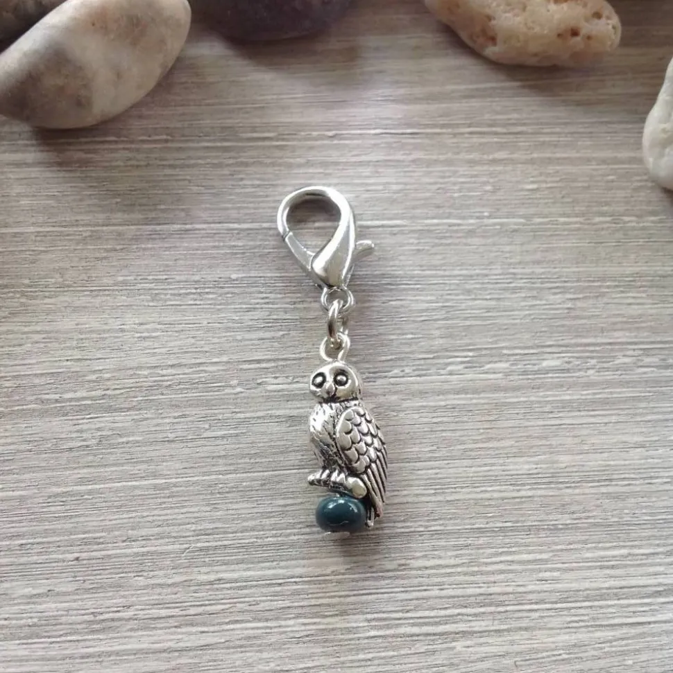 Die kleine, ca 1,3 cm hohe Eule aus Metall ’sitzt‘ auf einer kleinen Glasperle ( Rocaille / Durchmesser 4,5 mm ). Sie ist mit einer Metallöse an dem 1,6 cm hohen Karabiner befestigt. Mit Hilfe des Karabiners lässt sie sich bequem an Taschen, Mäppchen, Ketten etc befestigen. Die Gesamtlänge des Anhänger beträgt ca 3,7 cm