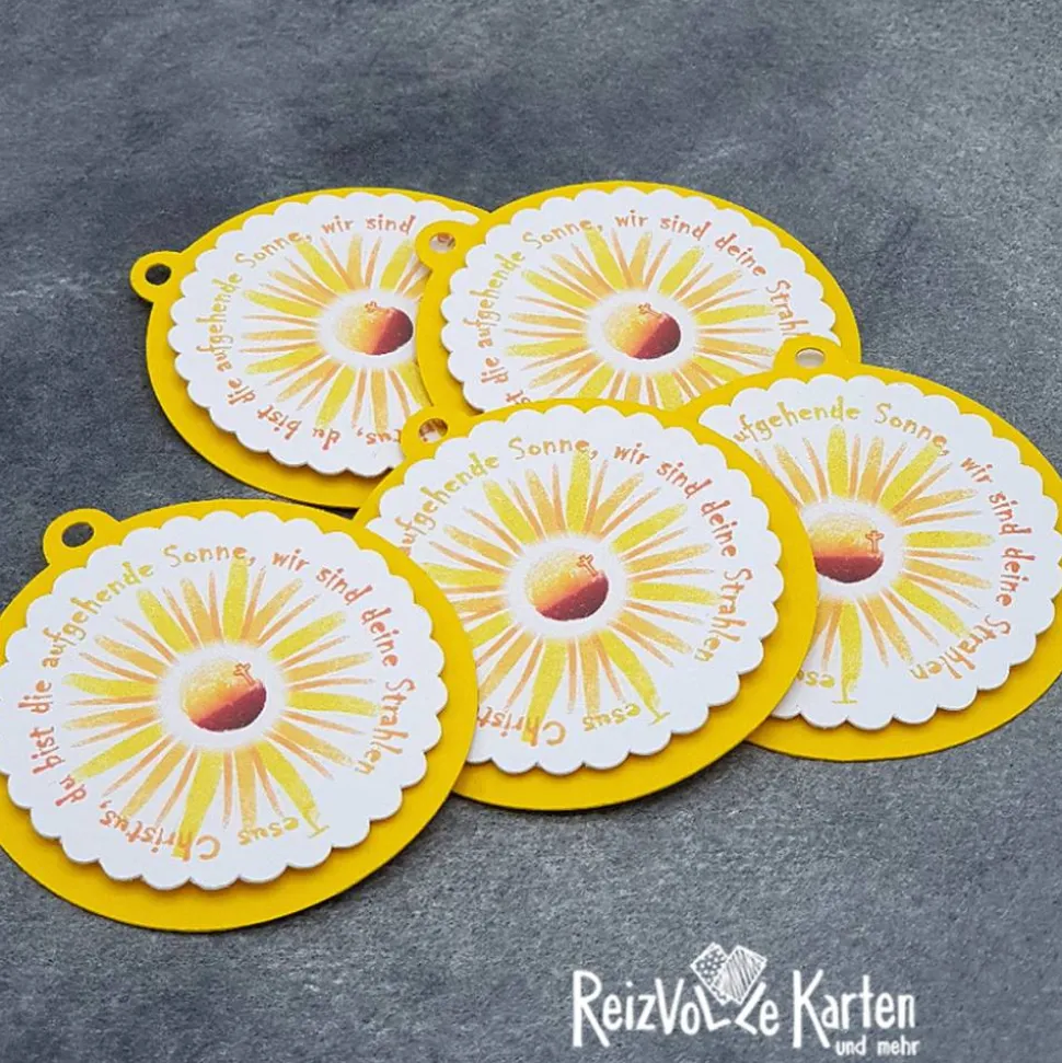 Die liebevoll gestalteten Anhänger mit dem inspirierenden Spruch „Jesus Christus, du bist die aufgehende Sonne, wir sind deine Strahlen“ sind perfekt für die Kommunion und andere christliche Feste. Sie haben einen Durchmesser von ca. 6 cm und bestehen aus hochwertiger Pappe (300 g/m²).