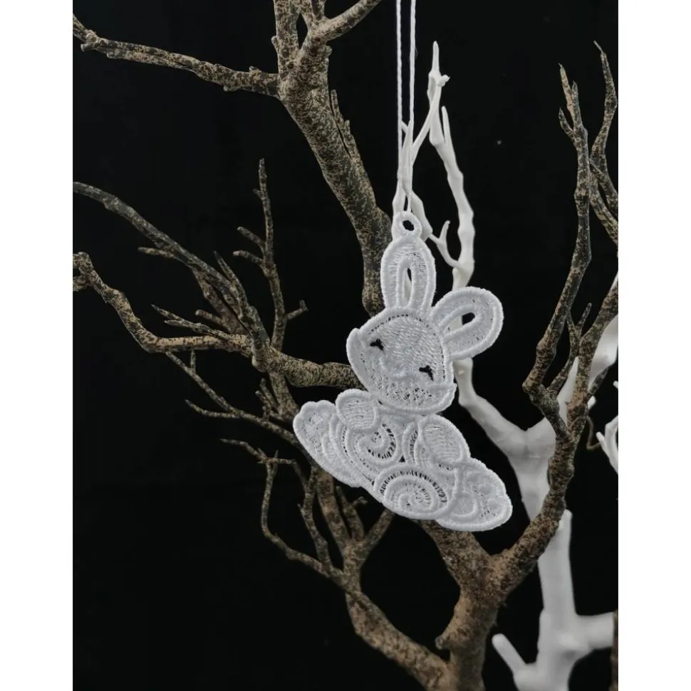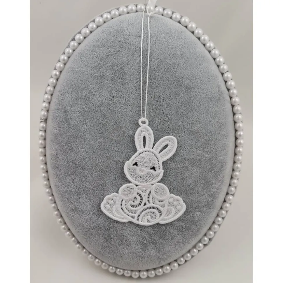 Lace Produkte werden mit einer Stickmaschine und Stickgarn auf wasserlöslichem Vlies gestickt. Nach dem Stickvorgang wird das Vlies ausgewaschen, sodass letztendlich nur die Stickerei übrig bleibt.
