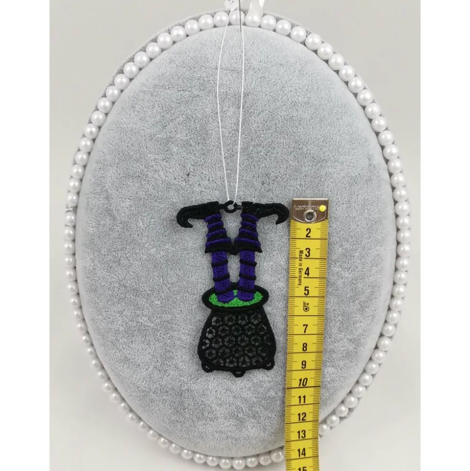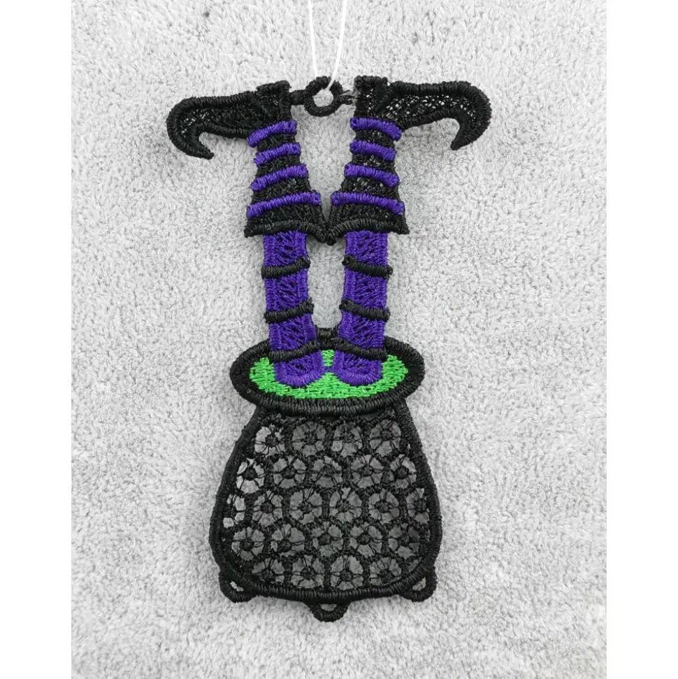 Lace Produkte werden mit einer Stickmaschine und Stickgarn auf wasserlöslichem Vlies gestickt. Nach dem Stickvorgang wird das Vlies ausgewaschen, sodass letztendlich nur die Stickerei übrig bleibt.