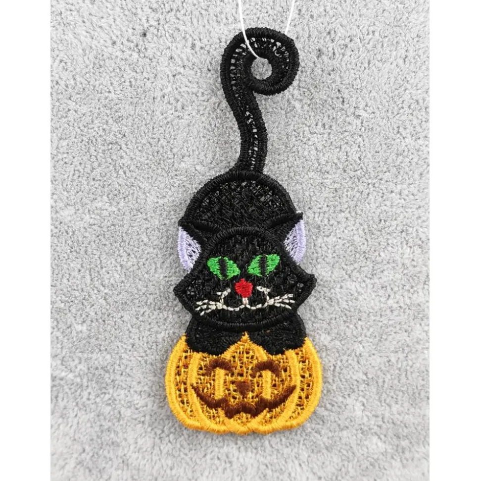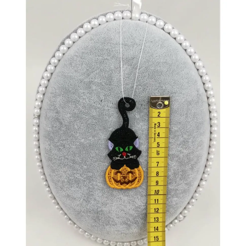 Lace Produkte werden mit einer Stickmaschine und Stickgarn auf wasserlöslichem Vlies gestickt. Nach dem Stickvorgang wird das Vlies ausgewaschen, sodass letztendlich nur die Stickerei übrig bleibt.
