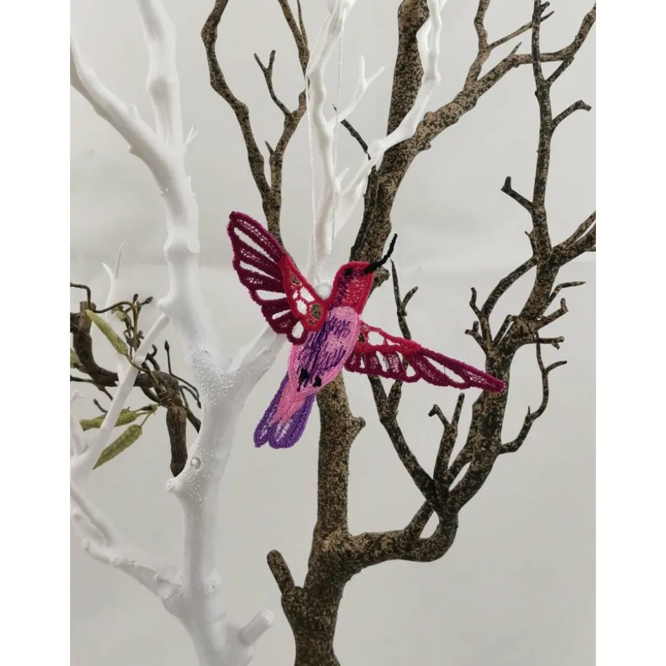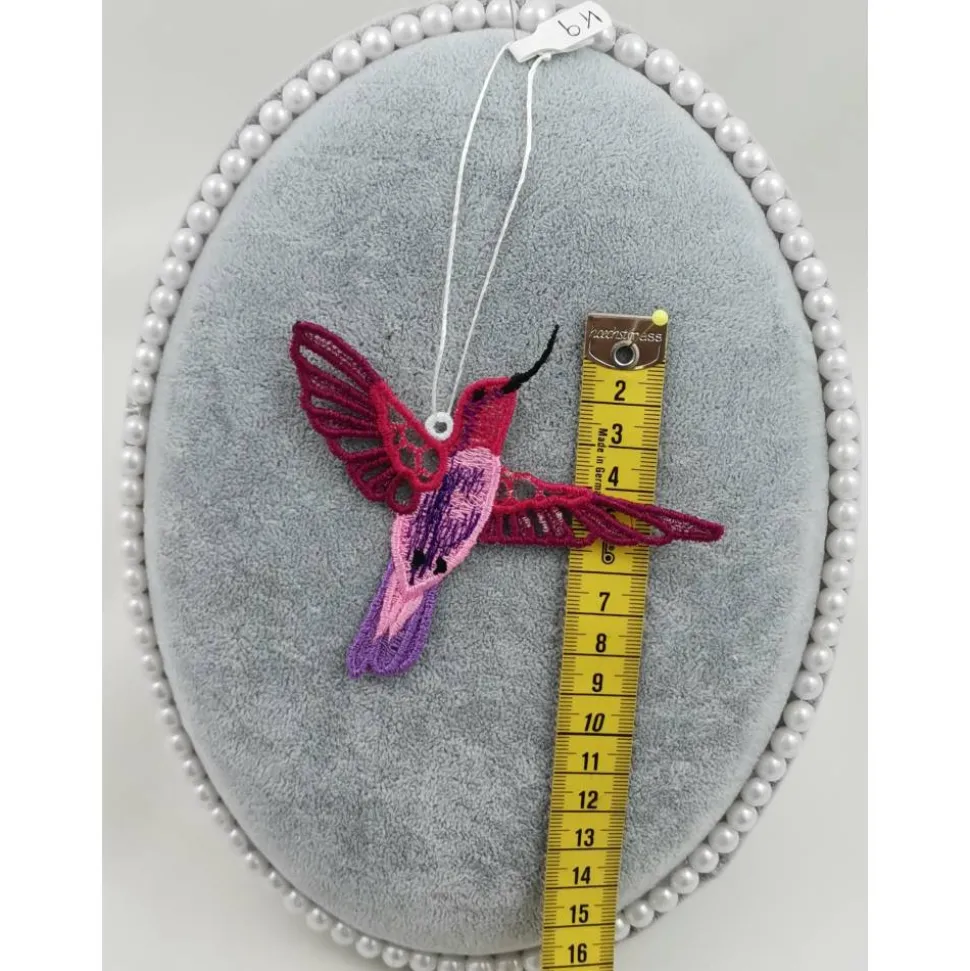 Lace Produkte werden mit einer Stickmaschine und Stickgarn auf wasserlöslichem Vlies gestickt. Nach dem Stickvorgang wird das Vlies ausgewaschen, sodass letztendlich nur die Stickerei übrig bleibt.