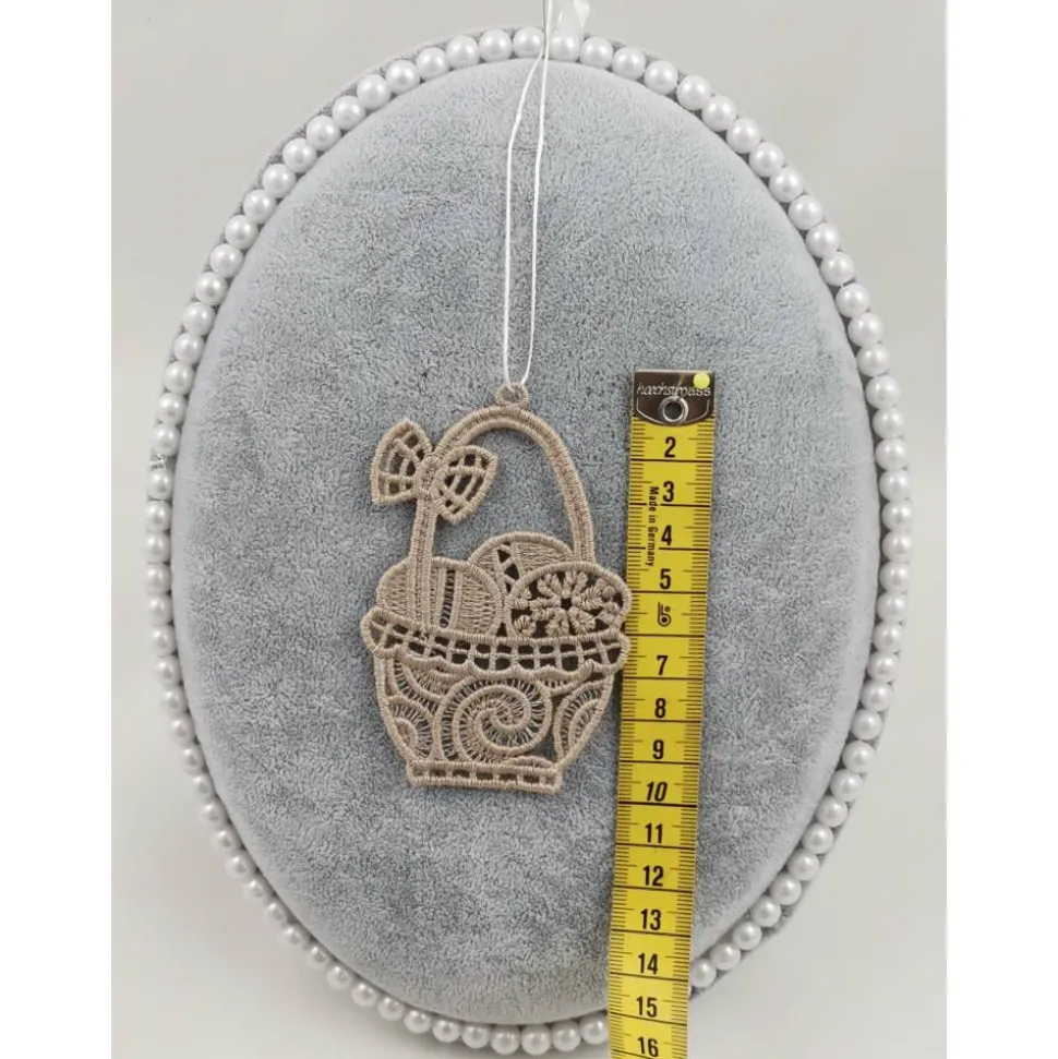 Lace Produkte werden mit einer Stickmaschine und Stickgarn auf wasserlöslichem Vlies gestickt. Nach dem Stickvorgang wird das Vlies ausgewaschen, sodass letztendlich nur die Stickerei übrig bleibt.