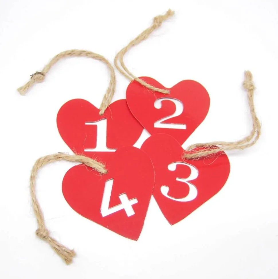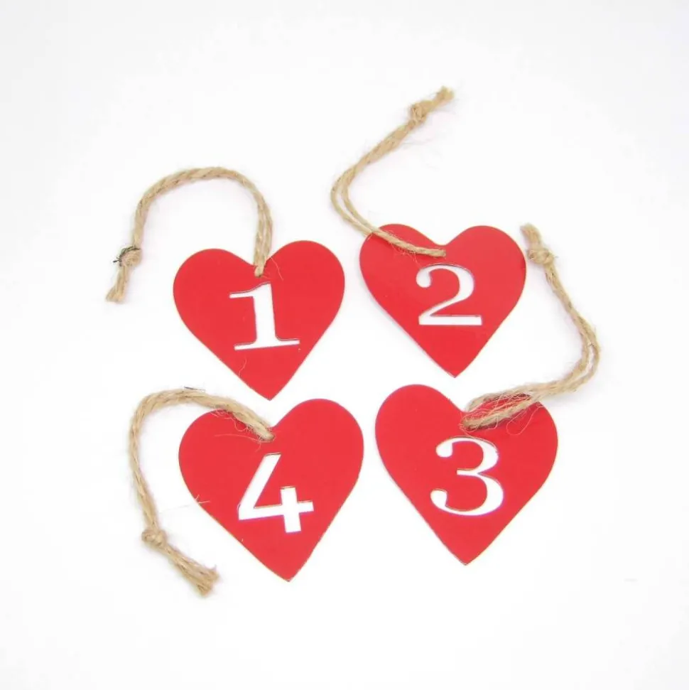 Die roten Metallherzen tragen die Zahlen für den Advent. Für jeden Adventssonntag eine.