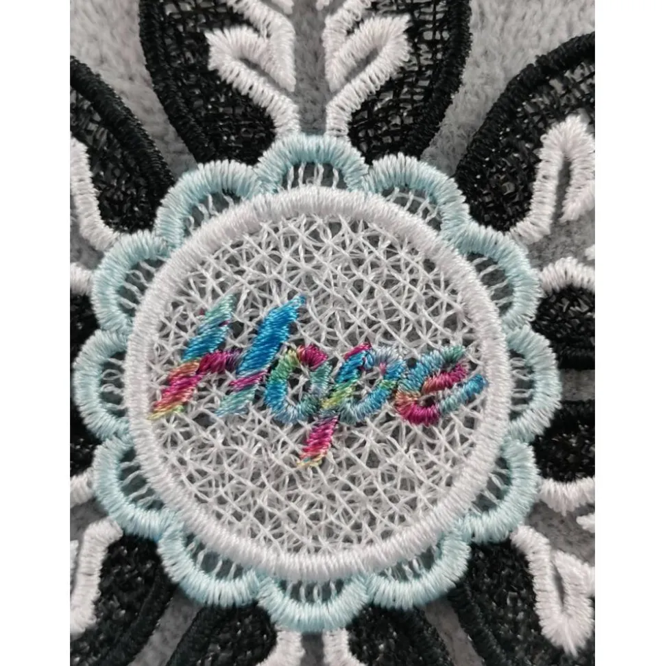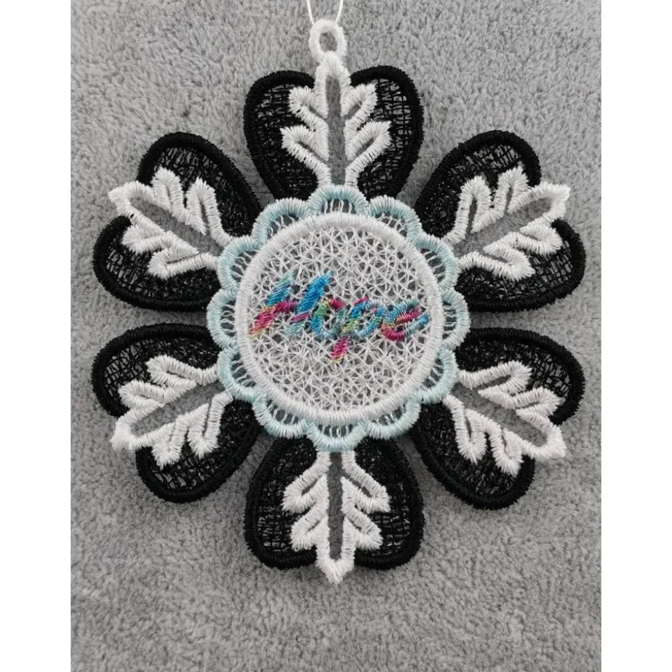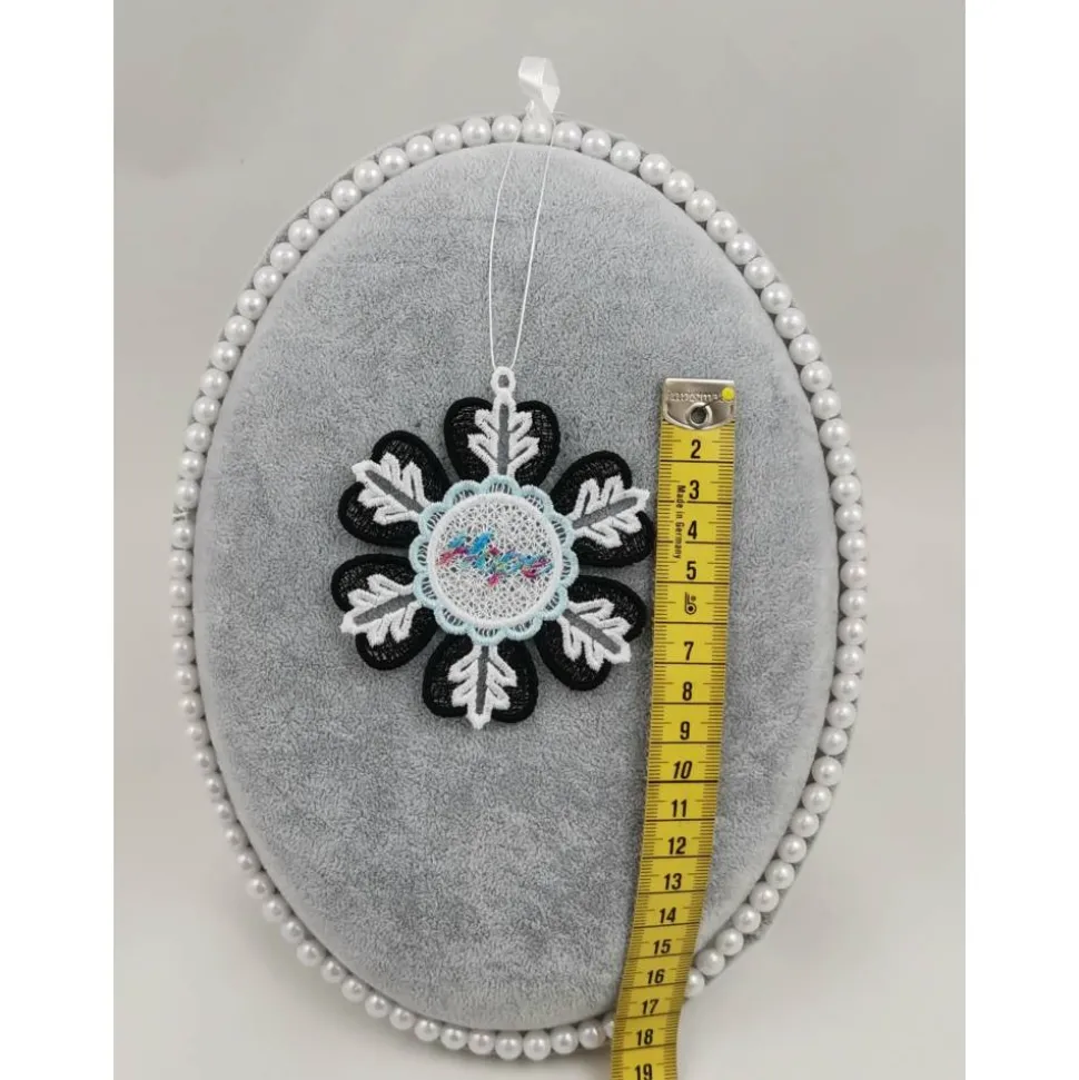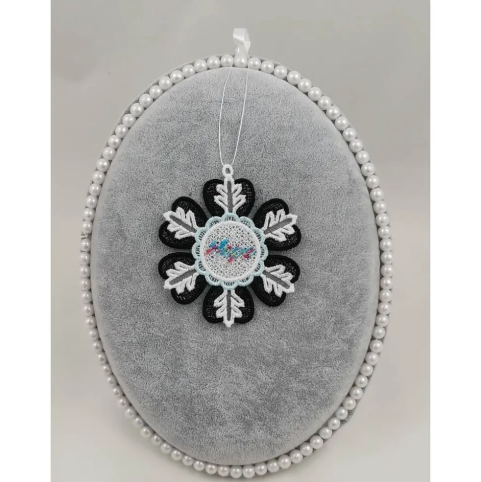 Lace Produkte werden mit einer Stickmaschine und Stickgarn auf wasserlöslichem Vlies gestickt. Nach dem Stickvorgang wird das Vlies ausgewaschen, sodass letztendlich nur die Stickerei übrig bleibt. Nach dem Trocknungsvorgang wird noch das Band zum aufhängen befestigt.