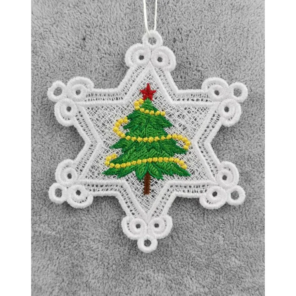 Lace Produkte werden mit einer Stickmaschine und Stickgarn auf wasserlöslichem Vlies gestickt. Nach dem Stickvorgang wird das Vlies ausgewaschen, sodass letztendlich nur die Stickerei übrig bleibt. Nach dem Trocknungsvorgang wird noch das Band zum aufhängen befestigt.