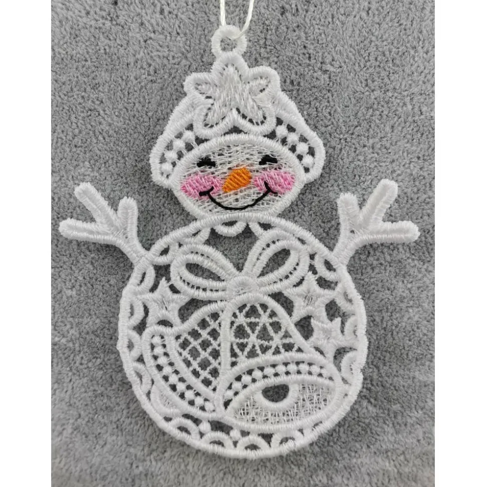 Lace Produkte werden mit einer Stickmaschine und Stickgarn auf wasserlöslichem Vlies gestickt. Nach dem Stickvorgang wird das Vlies ausgewaschen, sodass letztendlich nur die Stickerei übrig bleibt. Nach dem Trocknungsvorgang wird noch das Band zum aufhängen befestigt.