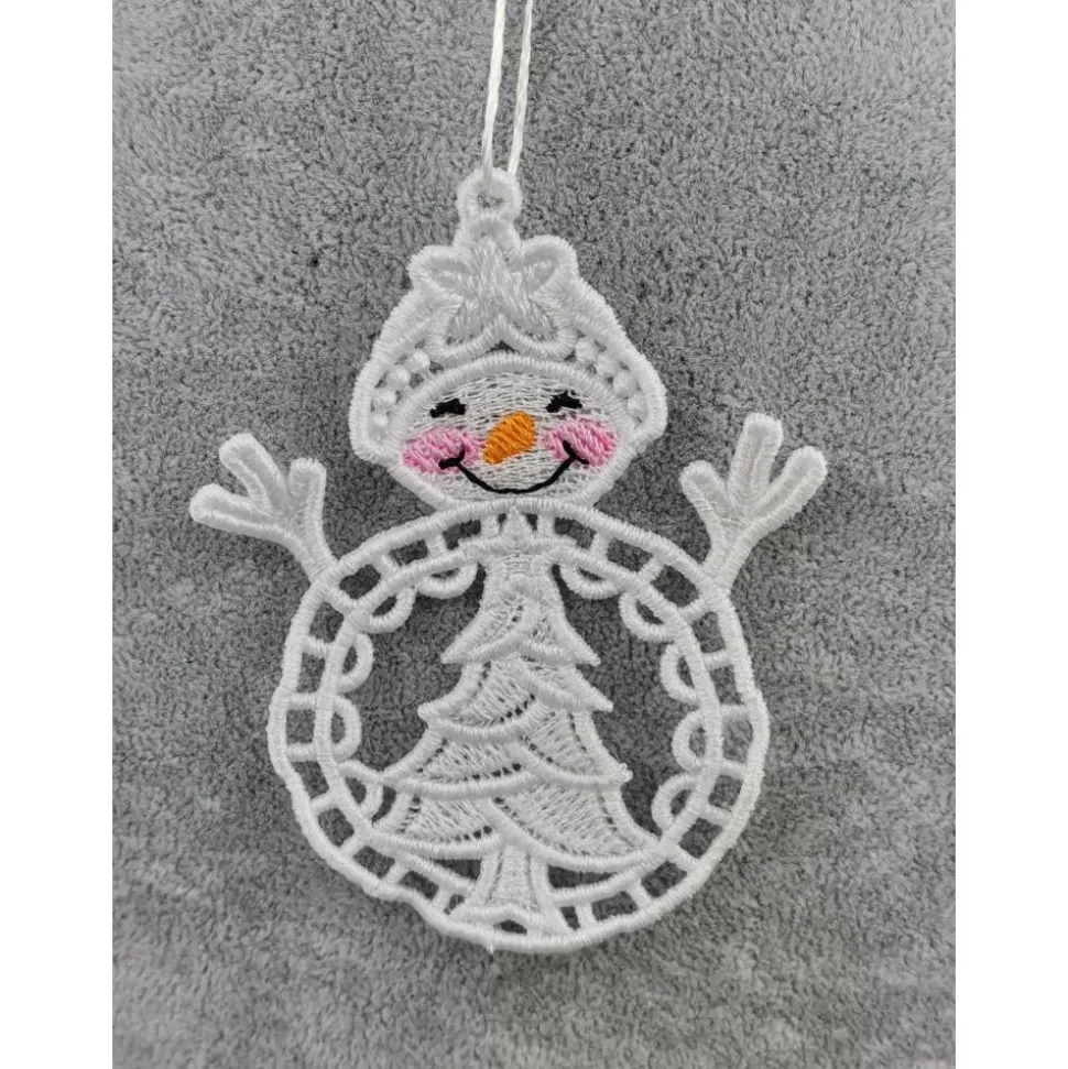 Lace Produkte werden mit einer Stickmaschine und Stickgarn auf wasserlöslichem Vlies gestickt. Nach dem Stickvorgang wird das Vlies ausgewaschen, sodass letztendlich nur die Stickerei übrig bleibt. Nach dem Trocknungsvorgang wird noch das Band zum aufhängen befestigt.