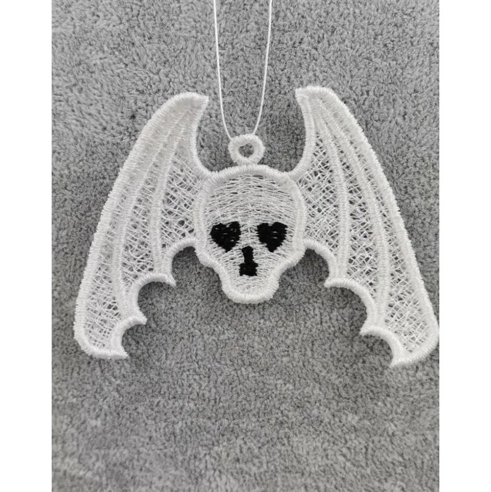 Lace Produkte werden mit einer Stickmaschine und Stickgarn auf wasserlöslichem Vlies gestickt. Nach dem Stickvorgang wird das Vlies ausgewaschen, sodass letztendlich nur die Stickerei übrig bleibt.