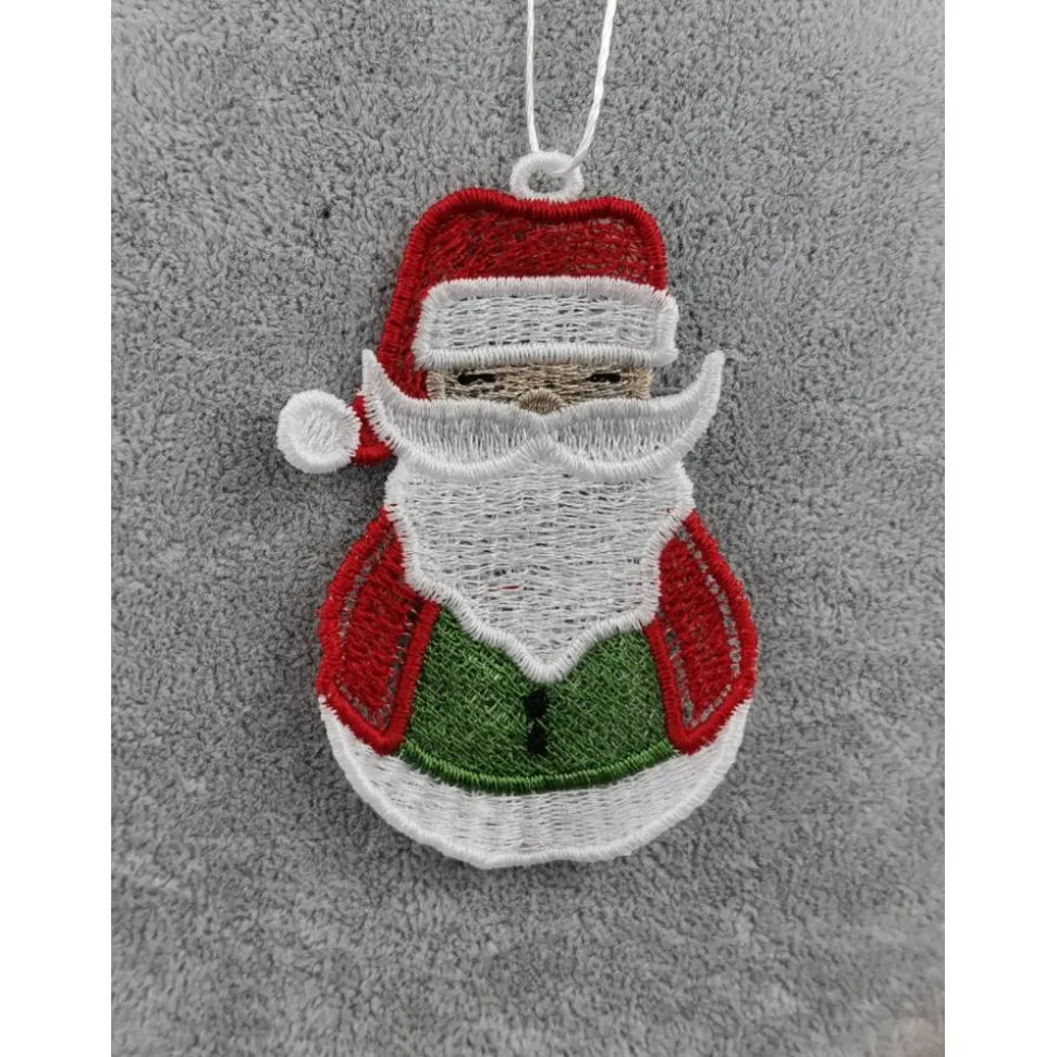 Lace Produkte werden mit einer Stickmaschine und Stickgarn auf wasserlöslichem Vlies gestickt. Nach dem Stickvorgang wird das Vlies ausgewaschen, sodass letztendlich nur die Stickerei übrig bleibt. Nach dem Trocknungsvorgang wird noch das Band zum aufhängen befestigt.