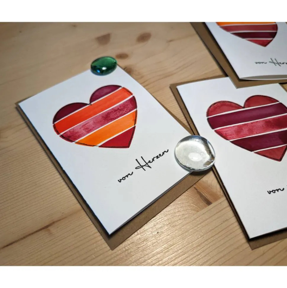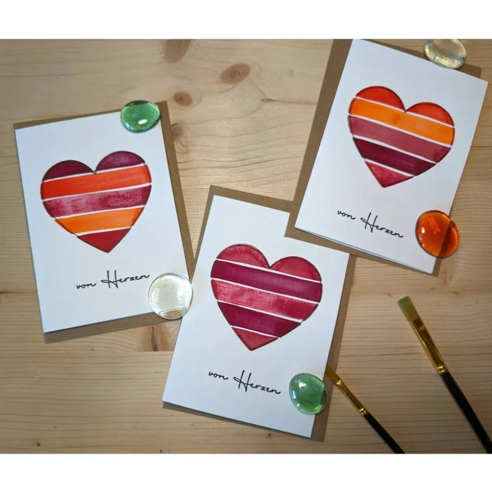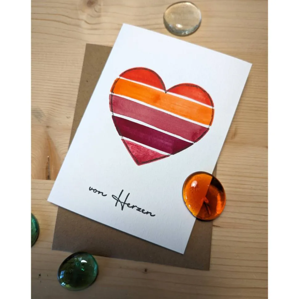 Diese naturweiße Klappkarte ist mit dem Schriftzug „Von Herzen“ bestempelt und mit einem Herz in verschiedenen Rottönen handbemalt. Die wunderschöne, farbenfrohe Karte wird durch einen Umschlag aus braunem Kraftpapier ergänzt.