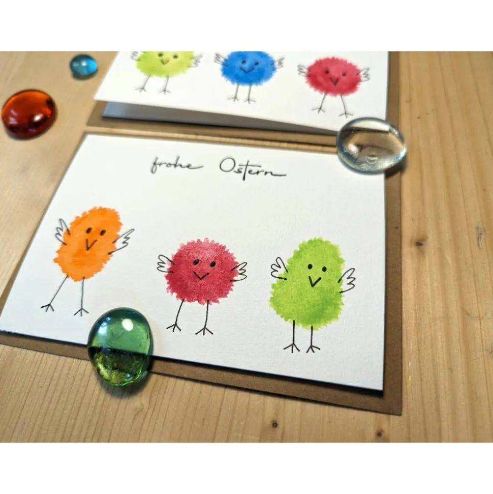 Diese naturweiße Klappkarte ist mit dem Schriftzug „Frohe Ostern“ bestempelt und mit 3 bunten Küken handbemalt. Die wunderschöne, farbenfrohe Karte wird durch einen Umschlag aus braunem Kraftpapier ergänzt.