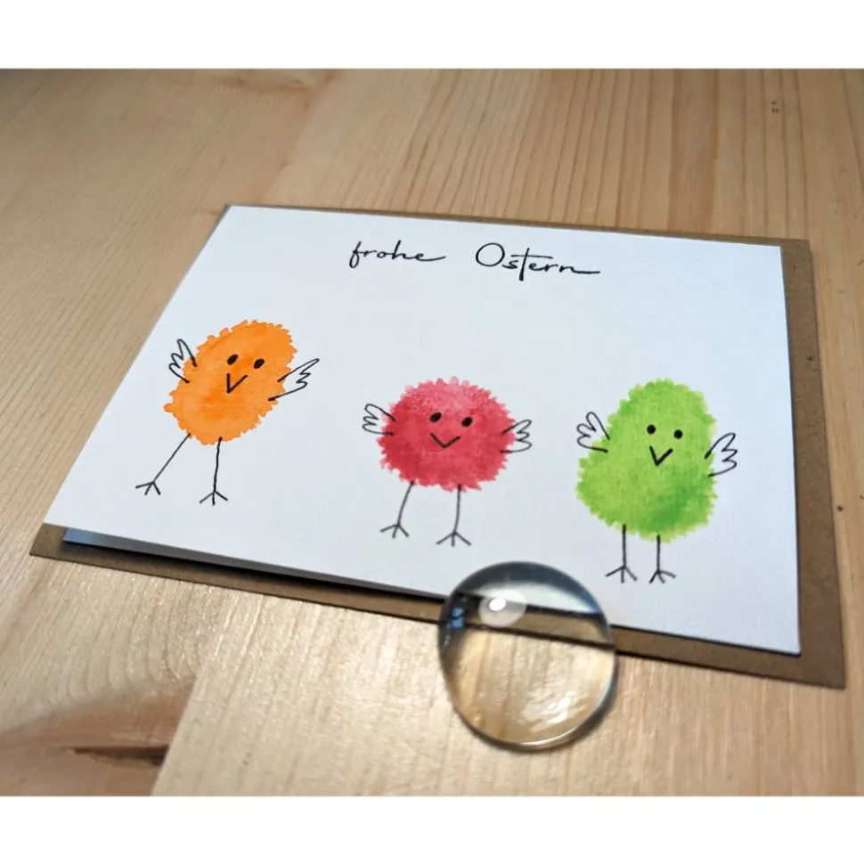 Jede Karte ist mit viel Liebe handgefertigt und unterscheidet sich leicht, u.a. in der Farbe und Form der 3 Küken. Die Fotos zeigen Beispiele. Die Auswahl erfolgt zufällig.