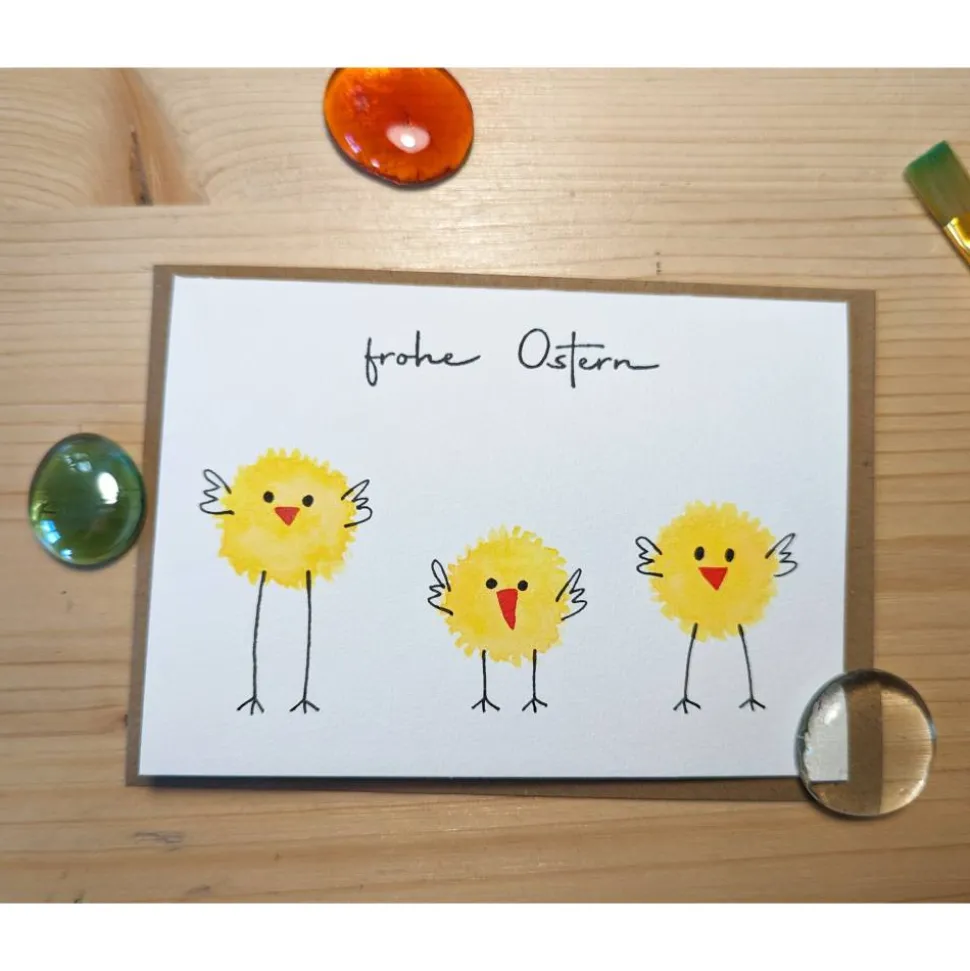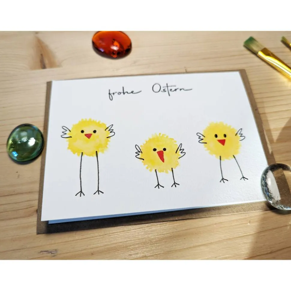Diese naturweiße Klappkarte ist mit dem Schriftzug „Frohe Ostern“ bestempelt und mit 3 gelben Küken handbemalt. Die wunderschöne, farbenfrohe Karte wird durch einen Umschlag aus braunem Kraftpapier ergänzt.