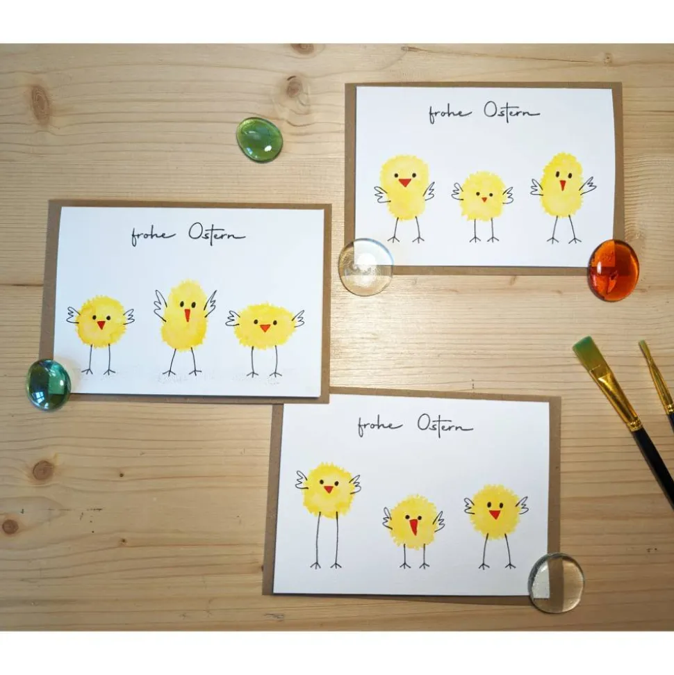 Jede Karte ist mit viel Liebe handgefertigt und unterscheidet sich leicht, u.a. in der Form der 3 Küken. Die Fotos zeigen Beispiele. Die Auswahl erfolgt zufällig.