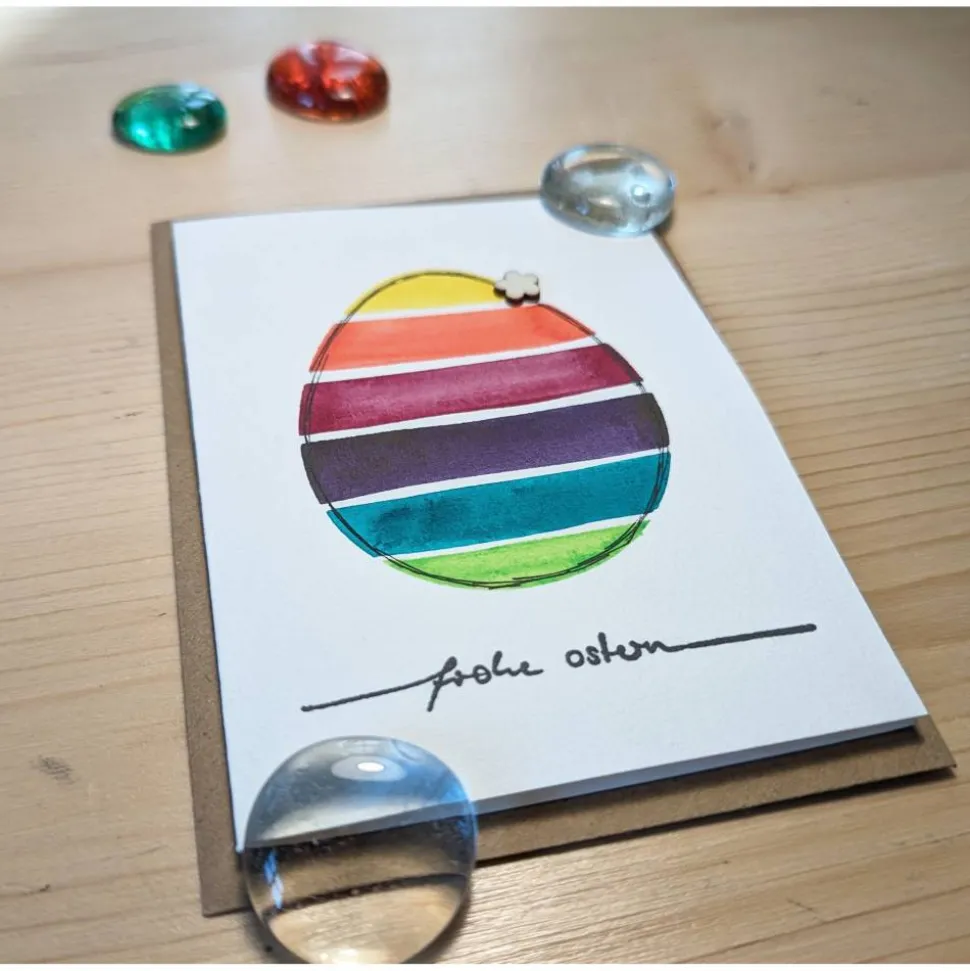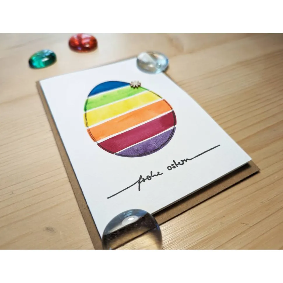 Diese naturweiße Klappkarte ist mit dem Schriftzug „Frohe Ostern“ bestempelt, mit einem bunten Ei handbemalt und einer kleinen Blüte aus Holz verziert. Die wunderschöne, farbenfrohe Karte wird durch einen Umschlag aus braunem Kraftpapier ergänzt.