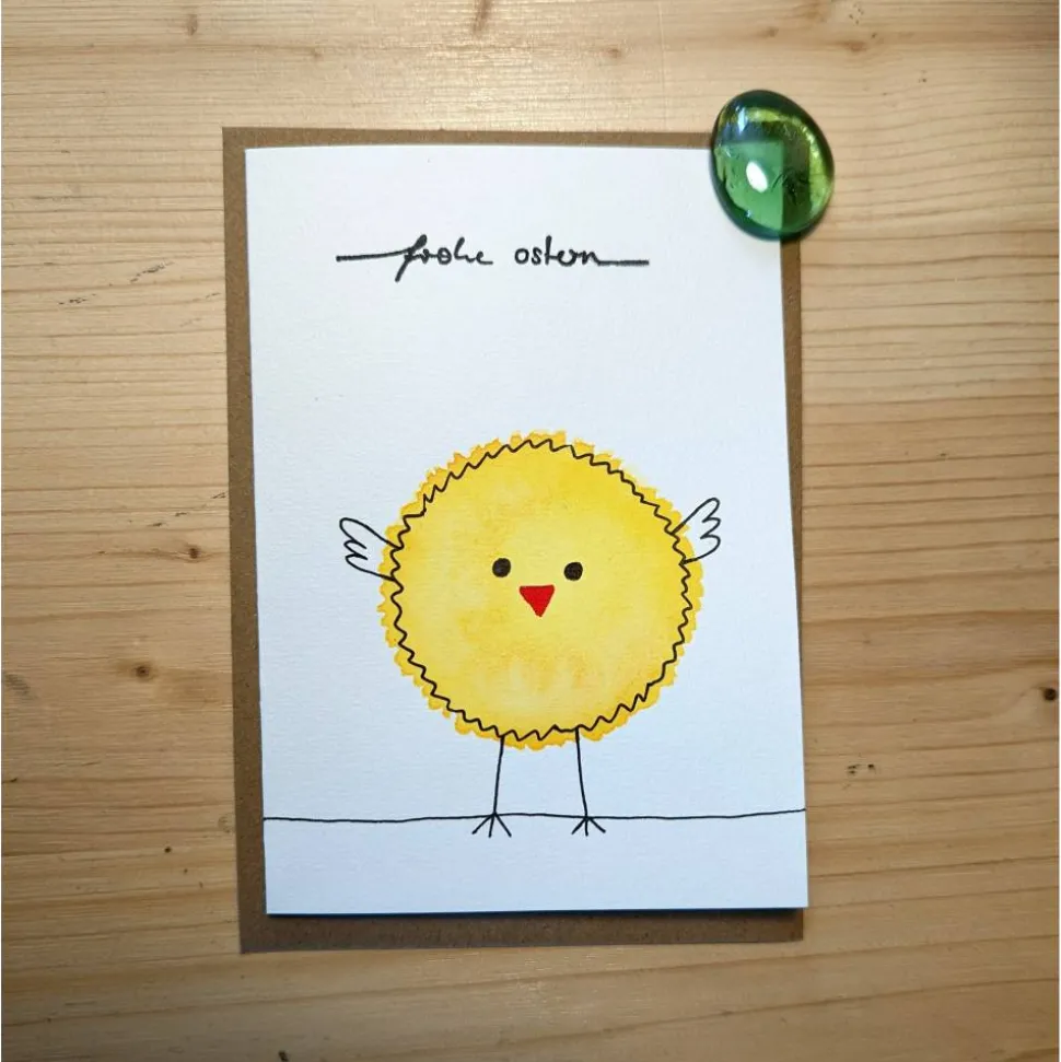 Diese naturweiße Klappkarte ist mit dem Schriftzug „Frohe Ostern“ bestempelt und mit einem gelben Küken handbemalt. Zusätzlich biete ich auch eine Variante mit einem aufgeklebten Holzei an. Die wunderschöne, farbenfrohe Karte wird durch einen Umschlag aus braunem Kraftpapier ergänzt.