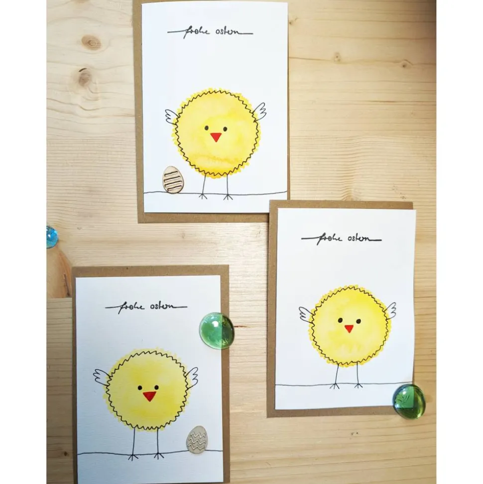 Jede Karte ist mit viel Liebe handgefertigt und unterscheidet sich leicht, u.a. in der Form des Kükens und im Muster des Holzeies. Die Fotos zeigen Beispiele. Die Auswahl erfolgt zufällig.