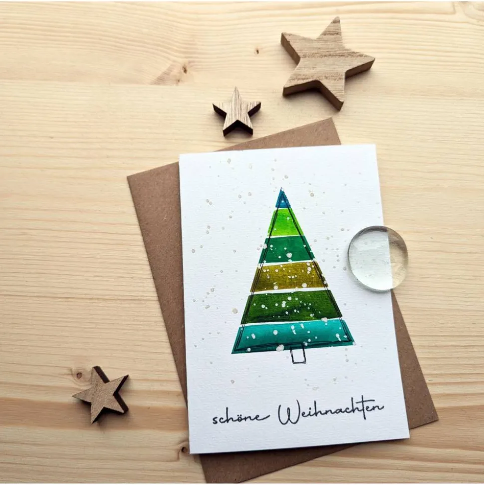 Diese naturweiße Klappkarte ist mit dem Schriftzug „schöne Weihnachten“ in schwarzer Farbe bestempelt, mit einem Tannenbaum in verschiedenen Grüntönen handbemalt und mit kleinen silber-weißen Farbspritzern als Schneeflocken verziert. Die wunderschöne, farbenfrohe Aquarell-Karte wird durch einen Umschlag aus braunem Kraftpapier ergänzt.