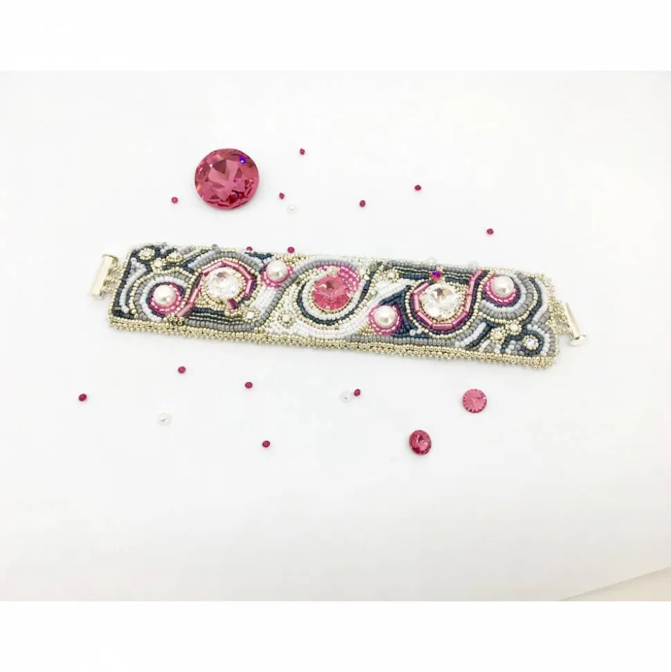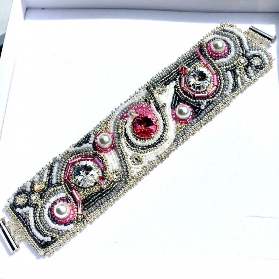 Ich habe dieses besondere Armband aus verschiedenen hohwertigen Perlen, Swarovski Elements ( Rivoli, Doppelkegel) und Wachsperlen gestickt. Der 3-strangige versilberte Verschluss ist magnetisch. Die Rückseite ist mit Ultra Suede grau gefüttert, ein sehr weicher Stoff.
