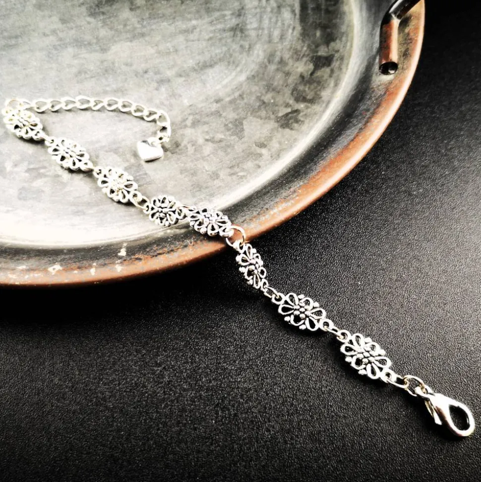 Die filigranen Blumenmuster auf dem Metallarmband verleihen Ihrem Outfit eine romantische Note und lassen Sie strahlen. Mit einer Länge von 18,50-23,50 cm ( Verlängerungskettchen) kann das Armband individuell angepasst werden, um perfekt um Ihr Handgelenk zu passen.
