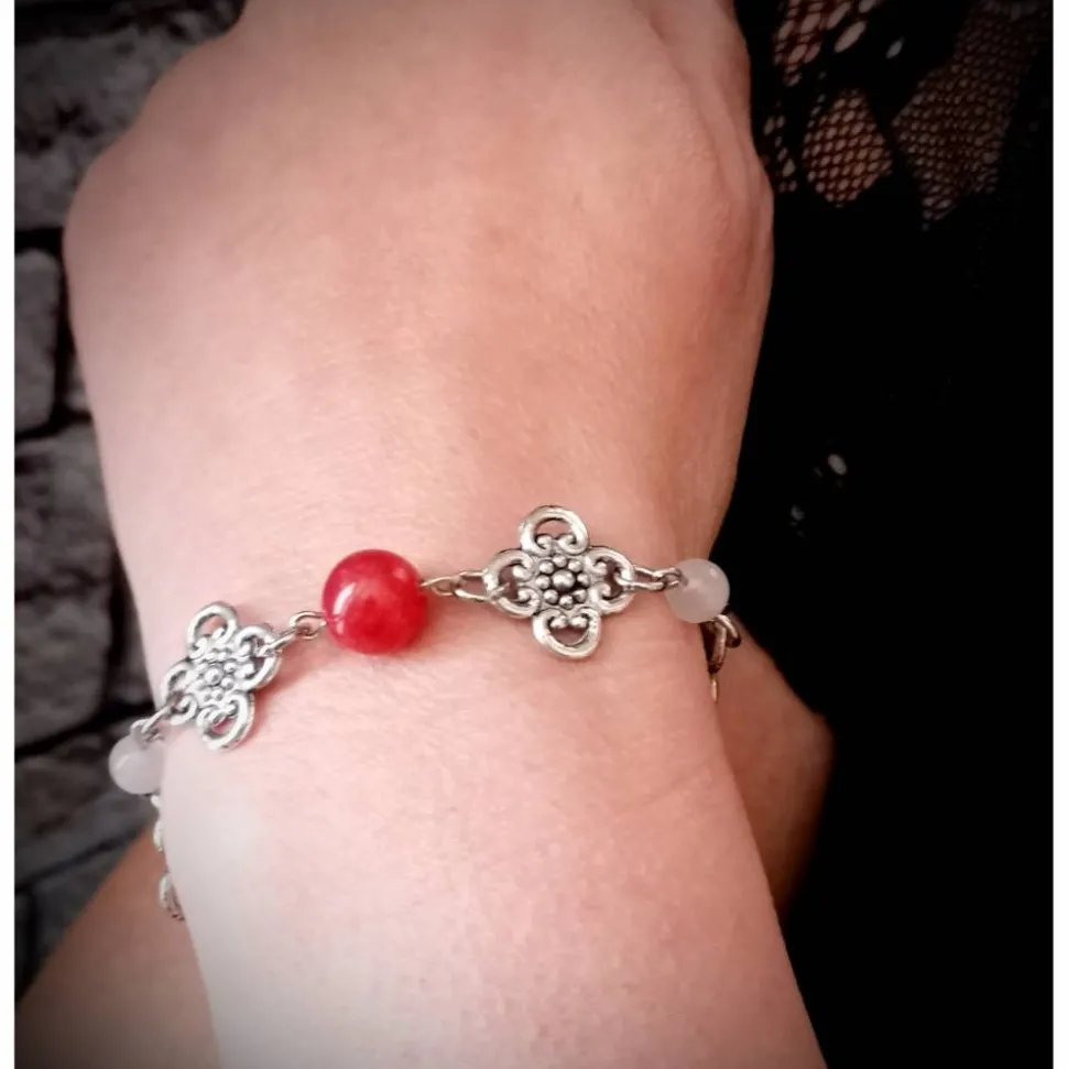 Zu schließen ist das Armband mit einem größeren Karabinerhaken, wo ebenfalls ein kleiner Schmuckanhänger ist.