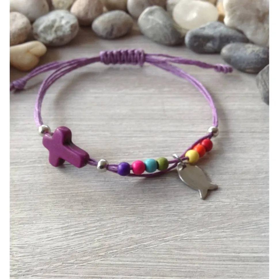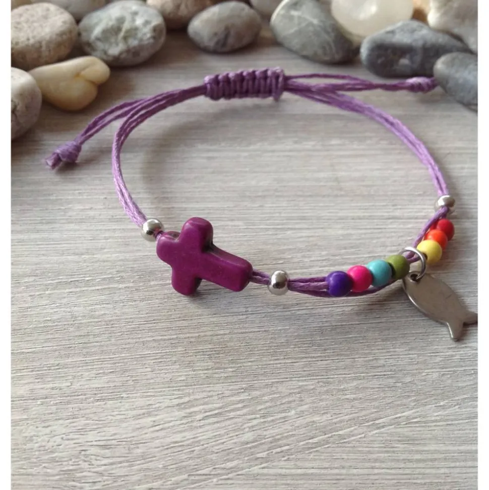 Das dreireihige Armband aus fliederfarbenen, gewachstem Baumwollband ( je 1mm stark ) ist mit einem kleinen Howlithkreuz ( ca 12mm x 16mm ), einem kleinen Edelstahlfisch ( Höhe ca 1 mm ) und bunten Howlithperlen verziert. Fixiert sind die einzelnen Elemente durch Crimpperlen. Die Länge des Armbandes lässt sich durch Verschieben des Knotens variieren. Sollte es zu lang sein- einfach die Enden neu verknoten und das ‚zu viel‘ abschneiden.