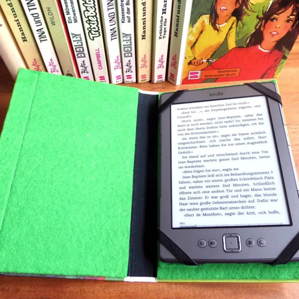 Damit dein e-Reader gut geschützt ist, ist sie innen mit Filz in deiner Lieblingsfarbe gepolstert. Der Buchblock wurde herausgetrennt und die Innenseite des Buchrückens mit Buchbinderleinen verstärkt.