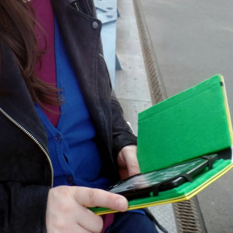 Dein eReader wird von vier schwarzen Gummibändern gehalten, die auf kleine Filzquadrate genäht sind. Mit einem weiteren Gummiband, das um die Rückseite des Buches geschoben wird, lässt sich die Hülle verschließen.