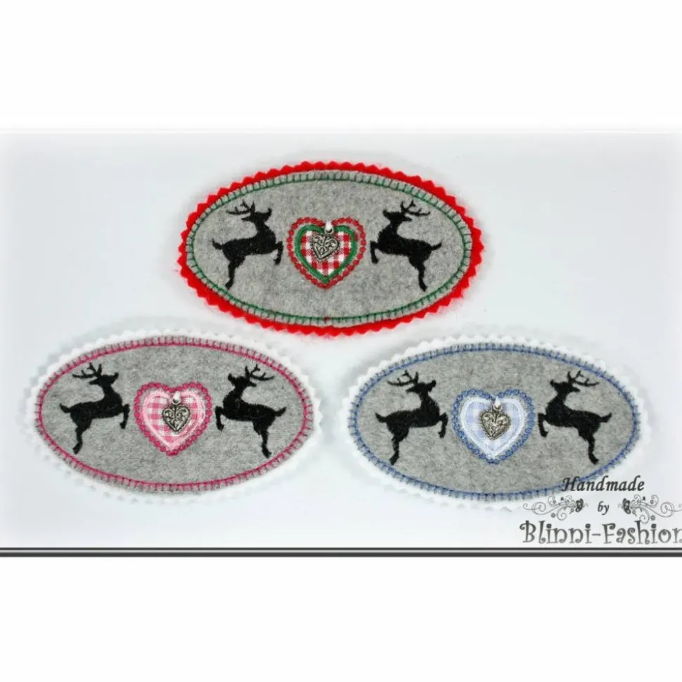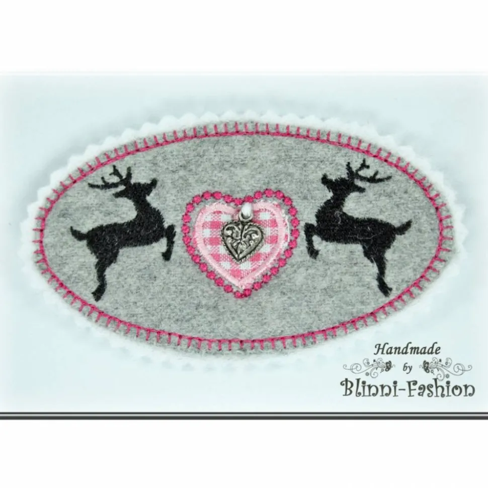 Süße, herzige Applikation im Trachten-Look, aus hellgrauem Kashmir/Wollstoff und Filz mit zwei stolzen Hirschen und einem Herz Ein kleines Trachtenherz aus Metall baumelt auf dem applizierten Herz.